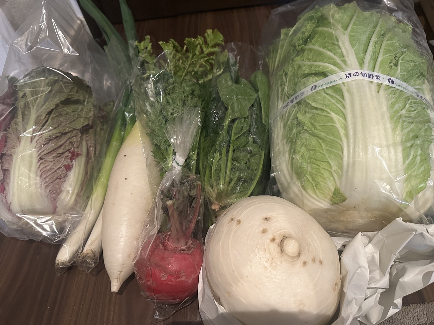 京都産 オレンジクイン白菜1玉、黃芯白菜1玉、聖護院大根1個、赤かぶ(もものすけ)1個、ほうれん草1把、赤ほうれん草1把