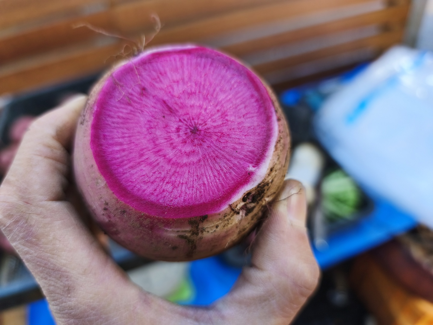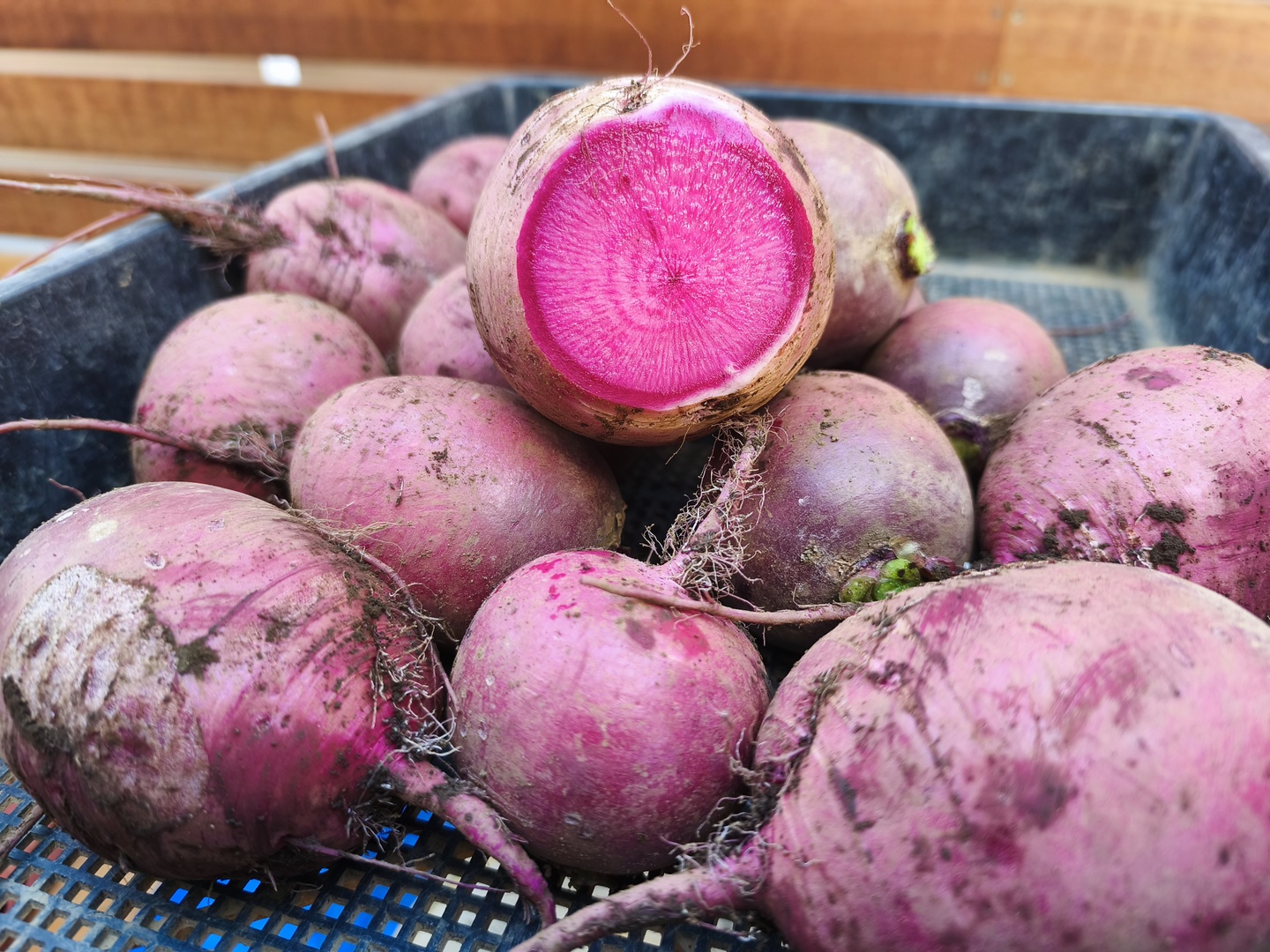 その名の通り、外も中も鮮やかな紅色が魅力の品種、紅くるり大根です。
