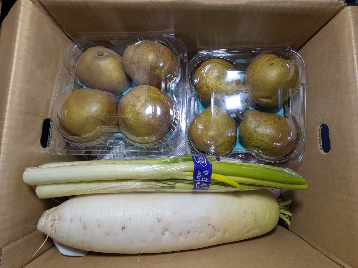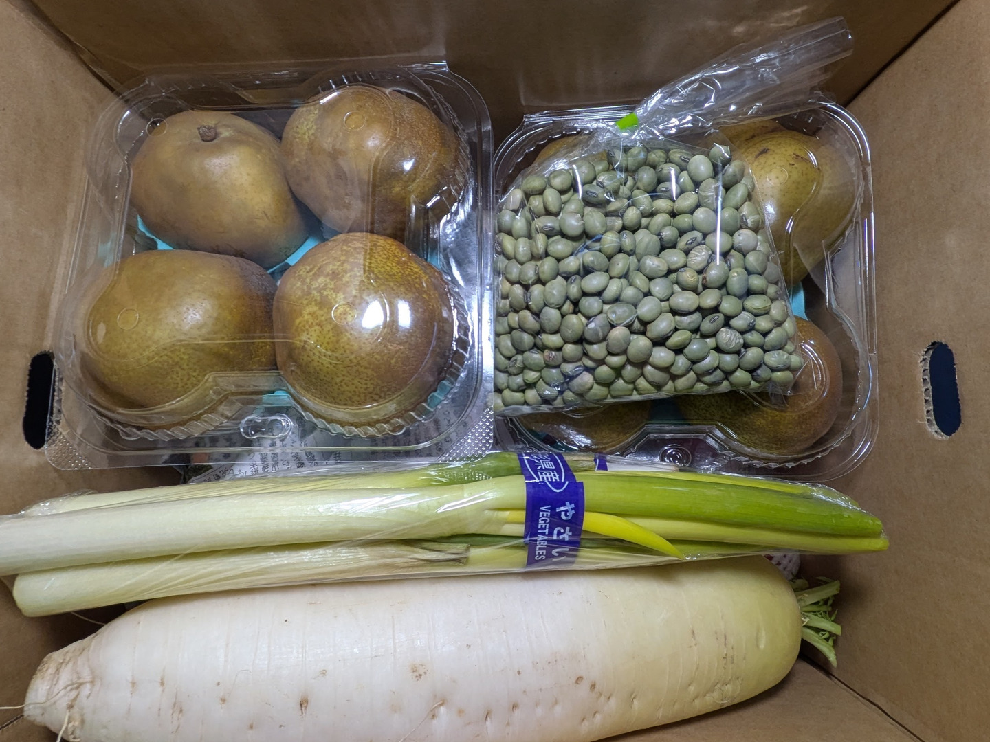 白菜2.5kg、大根1kg、ネギ300g、青大豆300g、リンゴ1.6kg、ラ・フランス2kgの詰め合わせです。す