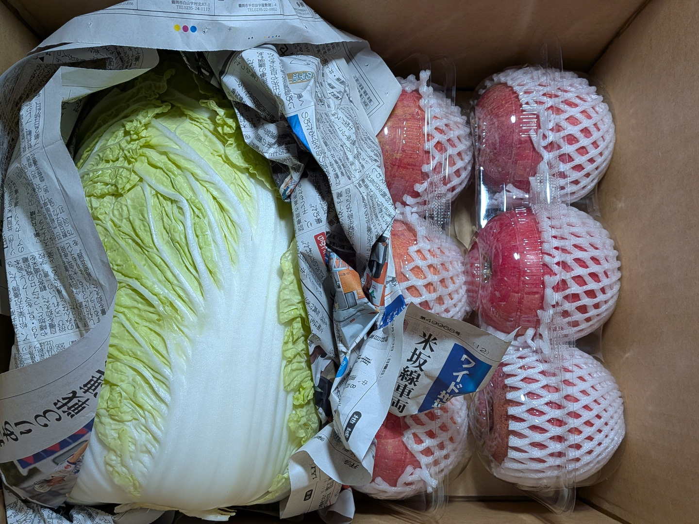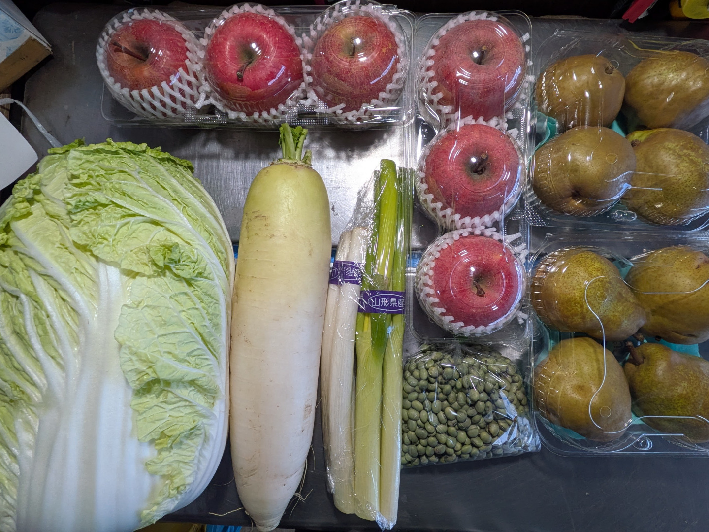 白菜は1球です。大根、ネギ、青大豆はB級品の直売品です。リンゴとラ・フランスは小さいサイズのキズ等があるB級品です。