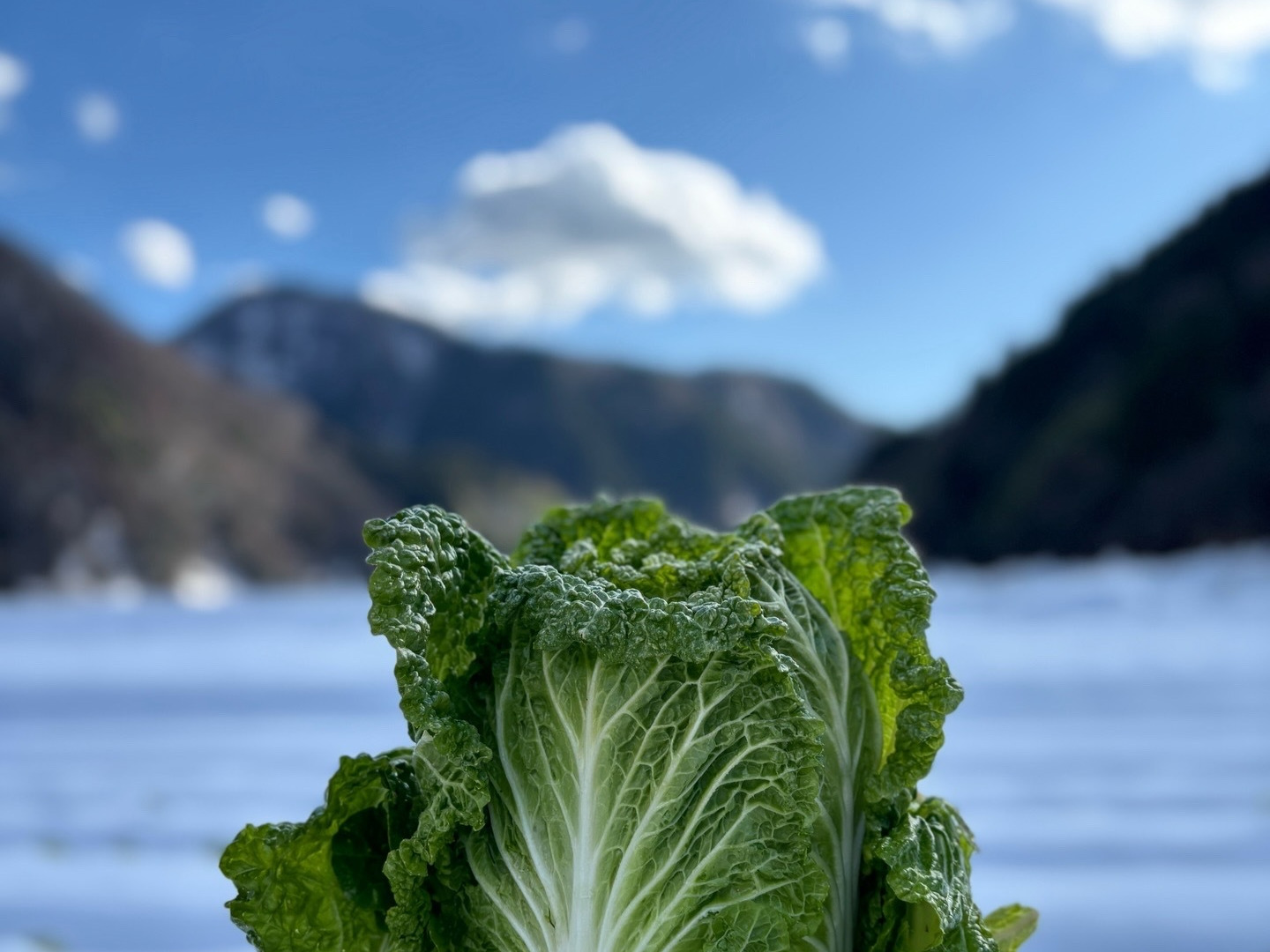 雪に覆われた畑の中、まるで白い布団に包まれるように眠り、寒さを凌ぐために自ら糖分をたっぷりと蓄えた白菜は、冬だけに出会える特別な味わいです。