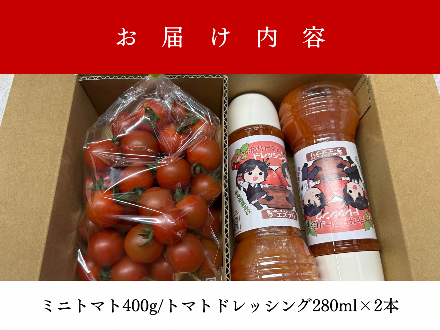 ●パリッと食べやすい当園定番のミニトマトとそのトマトのドレッシングセットです。