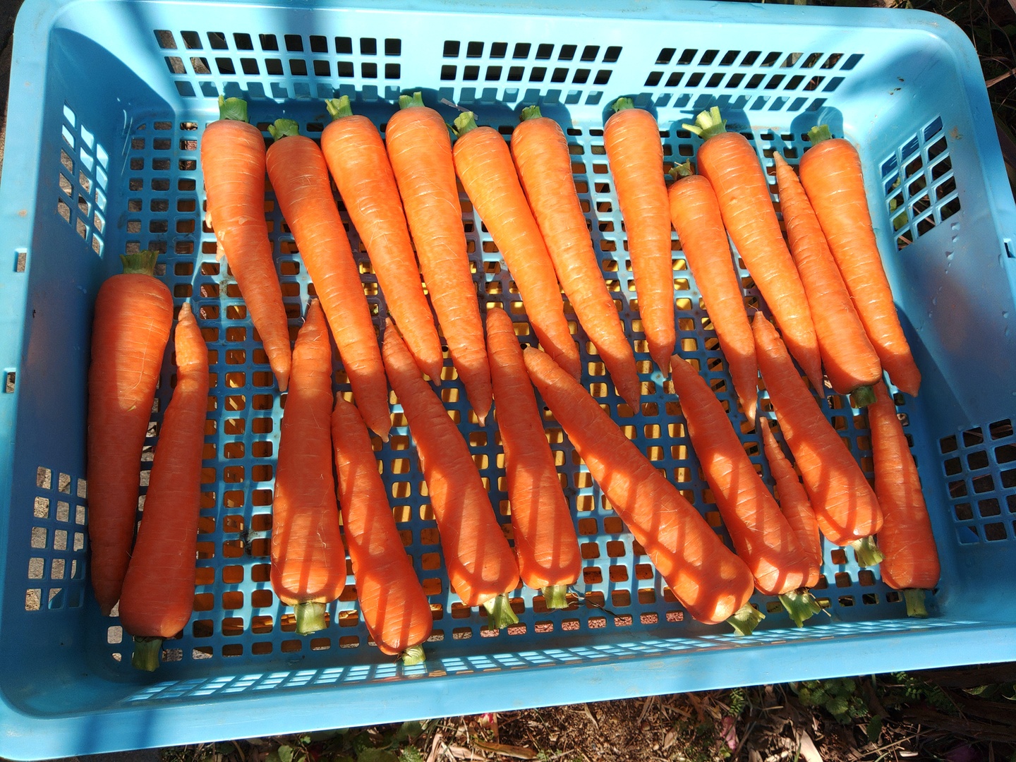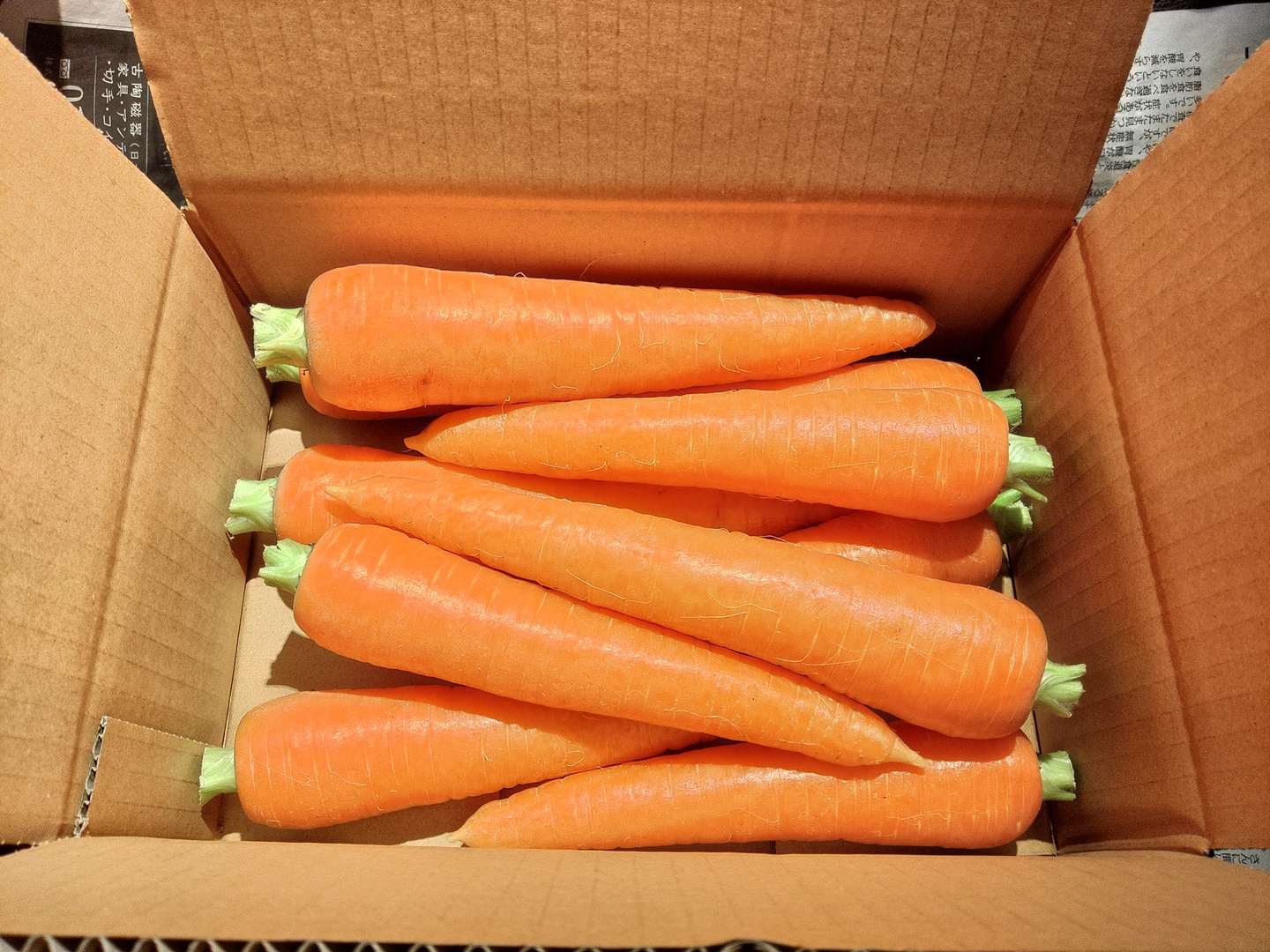 ニンジンは葉を切って、土を洗い流した状態のものをボードン袋に入れて、60サイズの段ボールでお送りします。