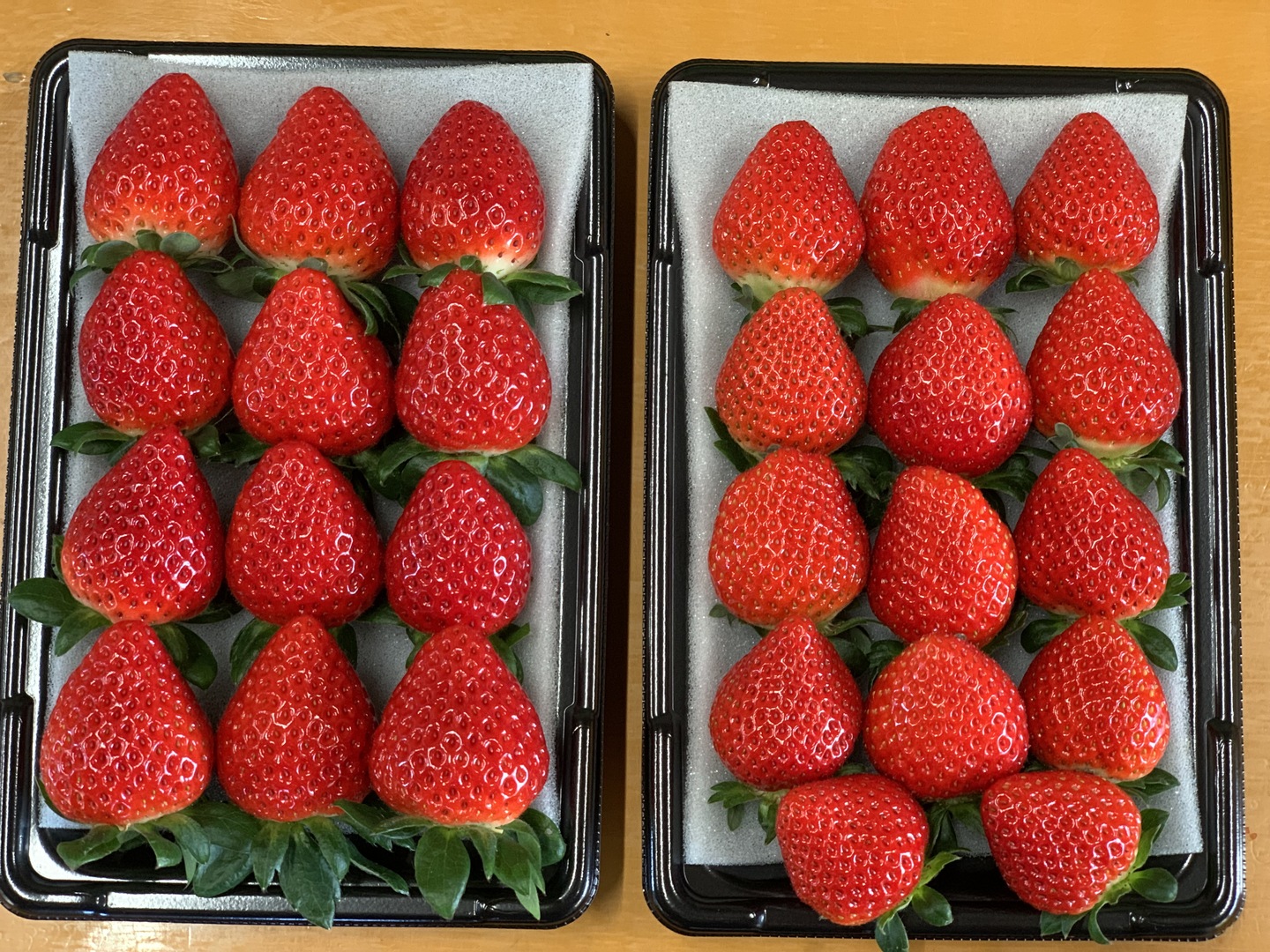 強い甘みとジューシーな「あまりん」、豊かな香りと甘酸っぱい濃厚な味わい「かおりん」。朝採りした完熟いちごを厳選して大粒・中粒をキレイに並べたパック詰めでお届けします。