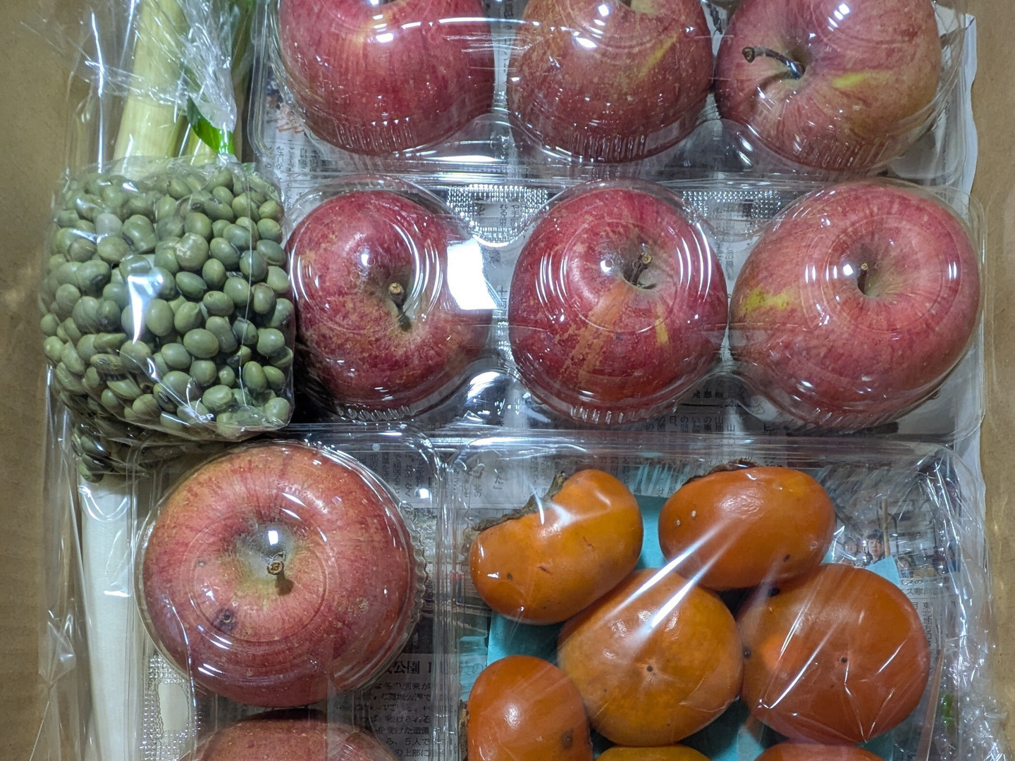 青大豆300g、ネギ300g、柿1kg、リンゴ2.5kgの詰め合わせです。