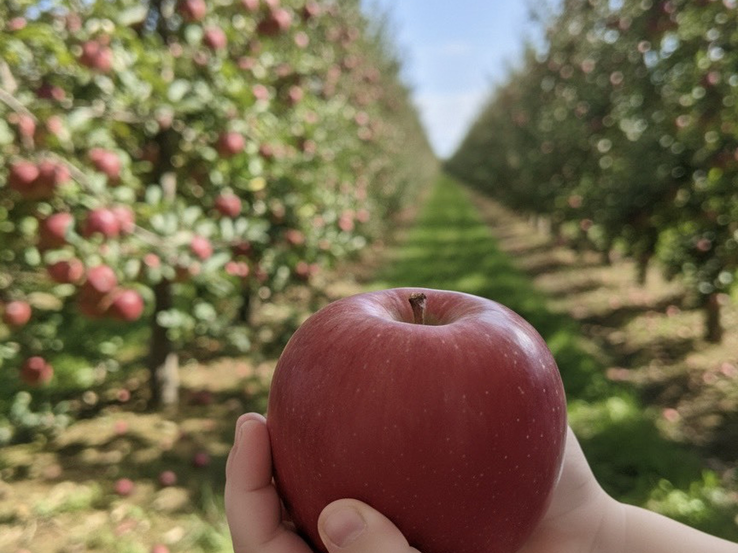 当園は長野県飯綱町は、丘陵地帯一面にりんご園広がっています。雨が少なく、標高も高いため昼夜の気温差が大きく、味ののった美味しい果実ができる産地として有名です。