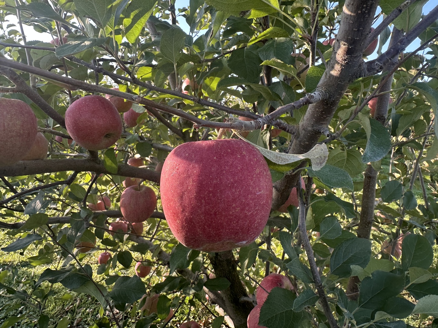 当園は長野県飯綱町は、丘陵地帯一面にりんご園広がっています。雨が少なく、標高も高いため昼夜の気温差が大きく、味ののった美味しい果実ができる産地として有名です。