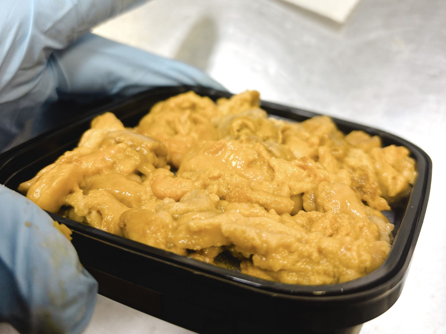 5℃以下の大型業務用冷蔵庫内で、なるべく空気に触れないよう密封し、冷蔵熟成。酸化を防ぎながら、ウニの旨味(アミノ酸)が最大化する瞬間をじっくりと待ちます。