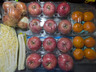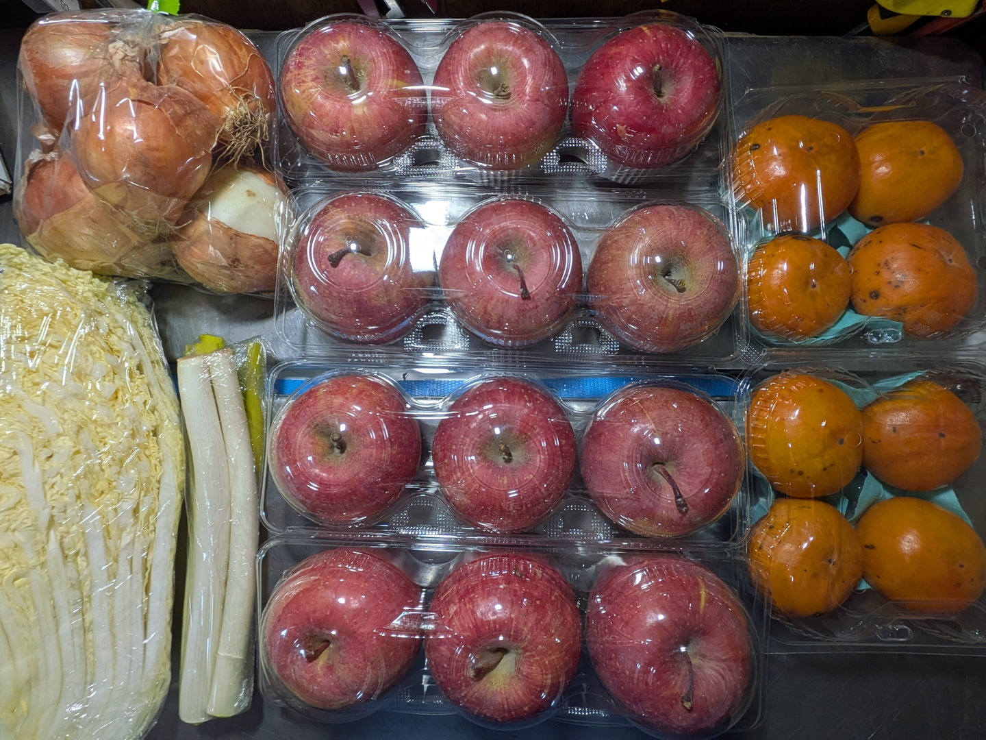 リンゴはふじのB級品で、キズ等があります。柿は富有柿ですが、食べ頃を過ぎて柔らかいものとそうでないものが混合しております。野菜類は低温貯蔵したものです。