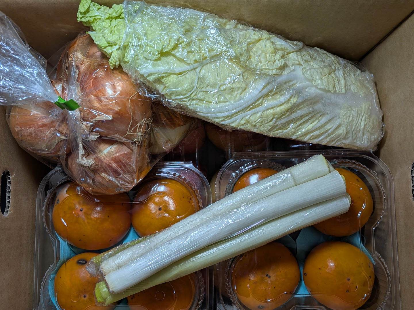 リンゴ3.6kg、柿1.2kg、ハクサイ700g、タマネギ1kg、ネギ200gの詰め合わせです。