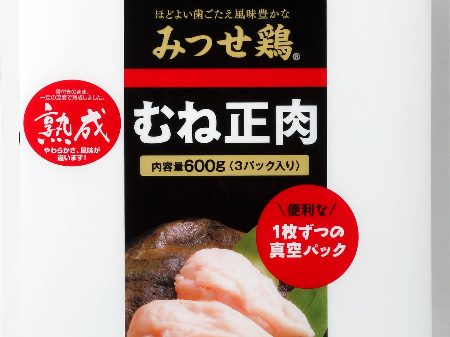 柔らかくしっとりとした舌ざわりで、噛みしめるたびに旨みが広がるみつせ鶏。そのむね肉を骨付きのまま4時間以上一定温度で熟成させ、やわらかさと旨みを増した熟成肉に仕上げました。1枚ずつの真空パックにしているので、使いたい分だけ解凍し、人気の低温調理や蒸し鶏など、様々な加熱料理にご利用ください。