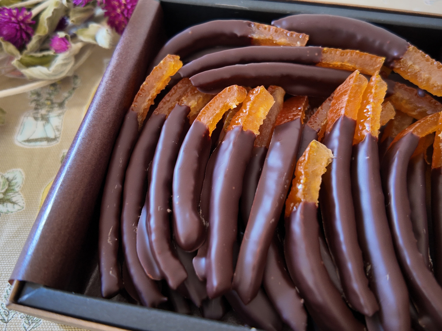 一口噛むと、今までの物に比べて、歯応えがありました。同時に質の良いチョコの甘さに甘夏皮のちょっぴり苦甘い味わいが広がって、いつもより大人向きだと感じました。それと、一つ目の、「甘夏皮が細い」理由も分かりました。これ以上太くすると、苦味が勝ってしまうから。