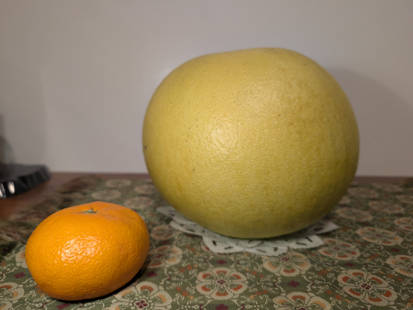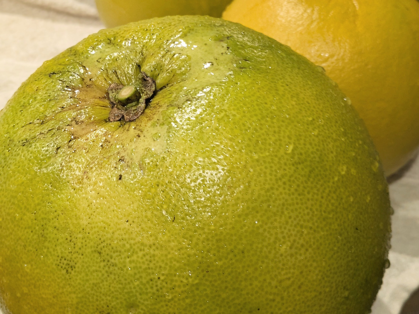 ボウリング玉のように大きな実を切り開けば、爽やかな香りとともにさっくりとした食感の房が顔をのぞかせます。