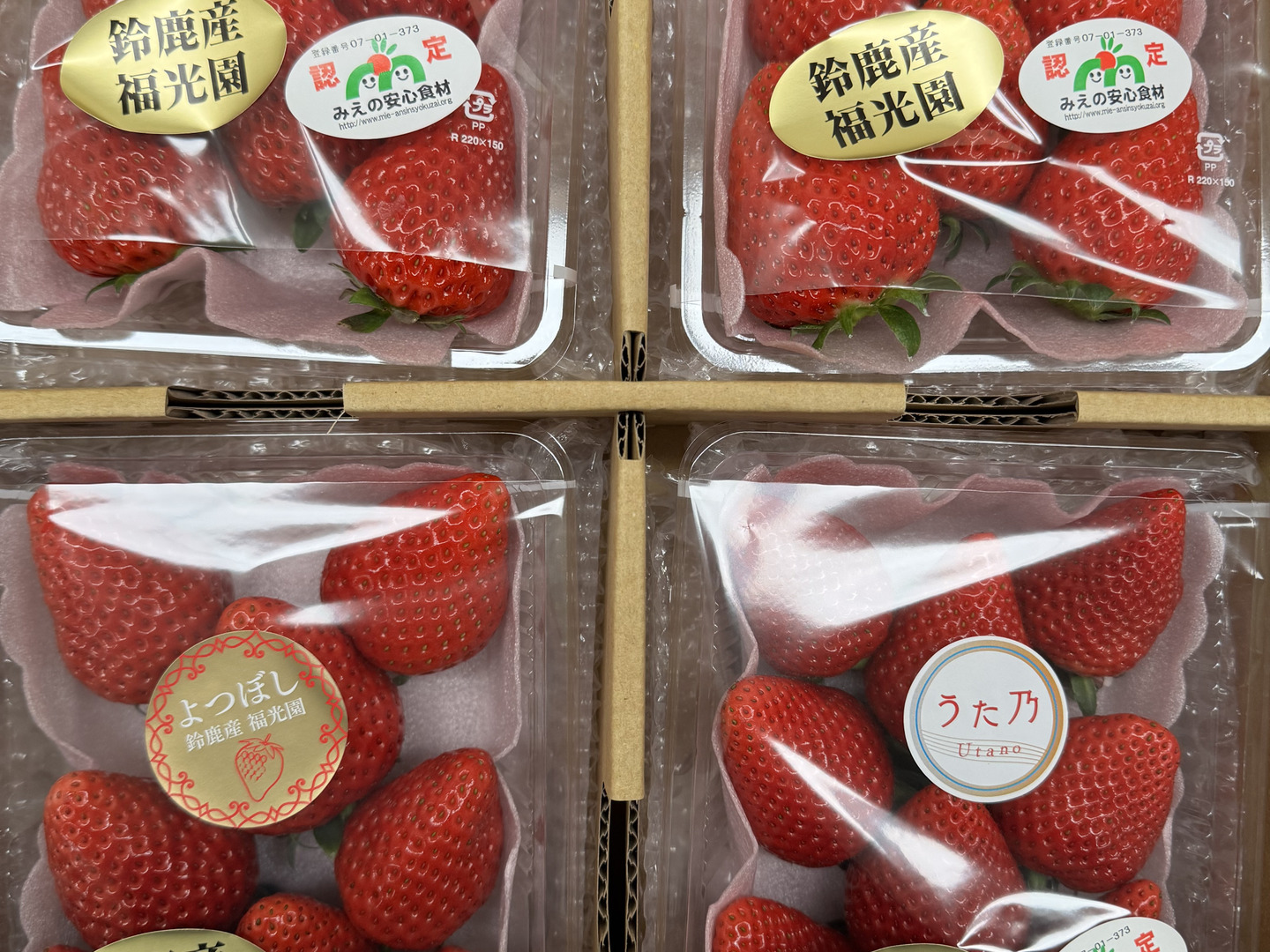 三重県オリジナル品種【うた乃】を中心に、章姫、紅ほっぺ、よつぼし、かおり野、3品種を選抜した食べ比べセット(品種は選べません。その日、状態の良い品種を選抜します。)1箱1.0kg~1.2kg