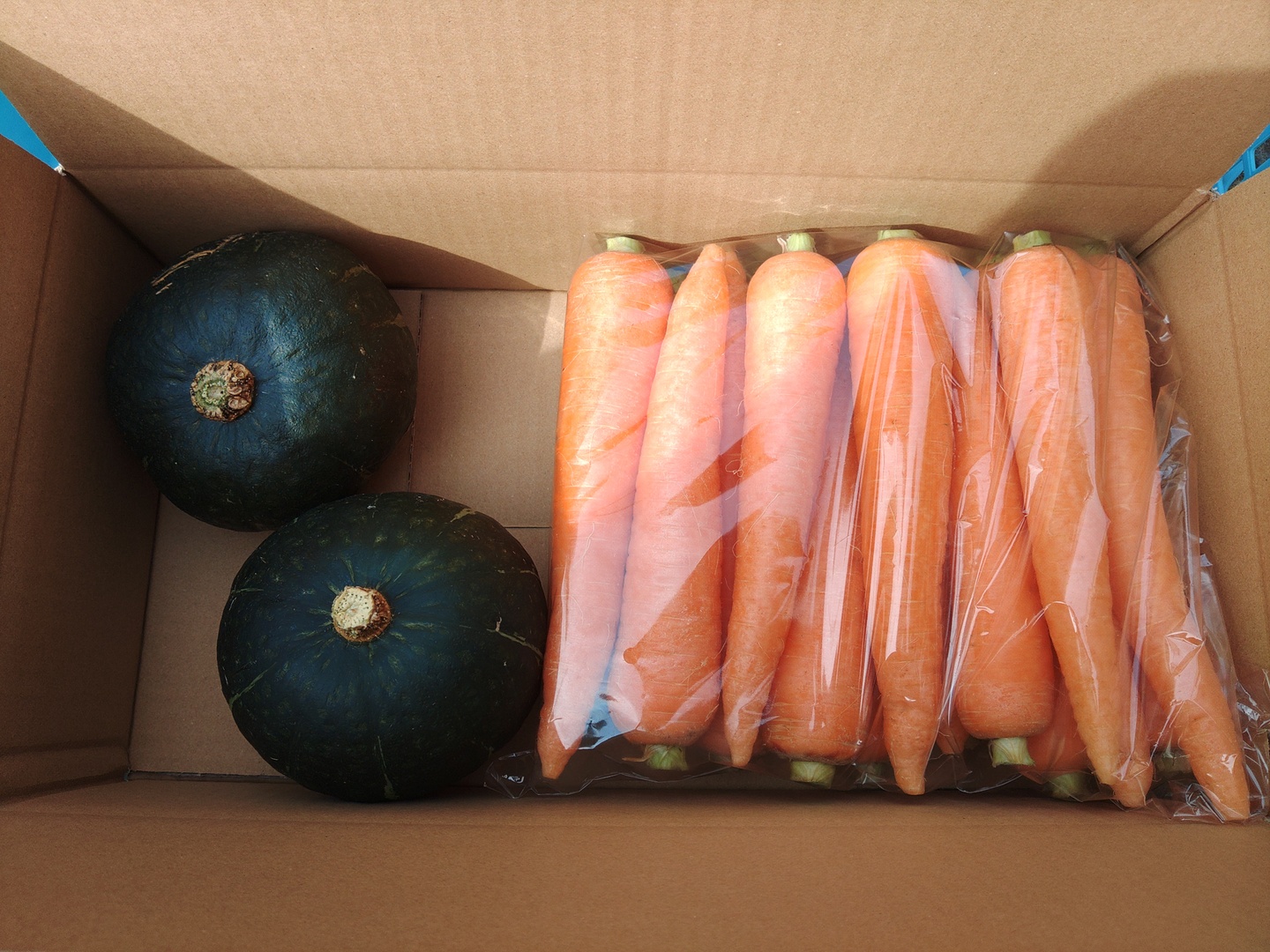 内容量は、ニンジン2.5kgと栗政宗かぼちゃ2個(600g程度を2個)です。