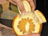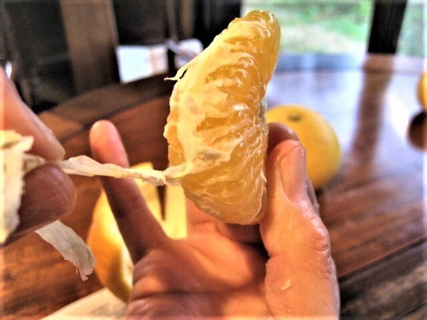 「甘夏」は、頭とお尻をカットして 放射線状に5本程度切り込みを入れて頂くと 外皮を剝くのが楽です。身を袋から取り出すのはノンストレス☆身離れの良さも採りたての魅力の1つです。
