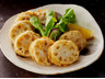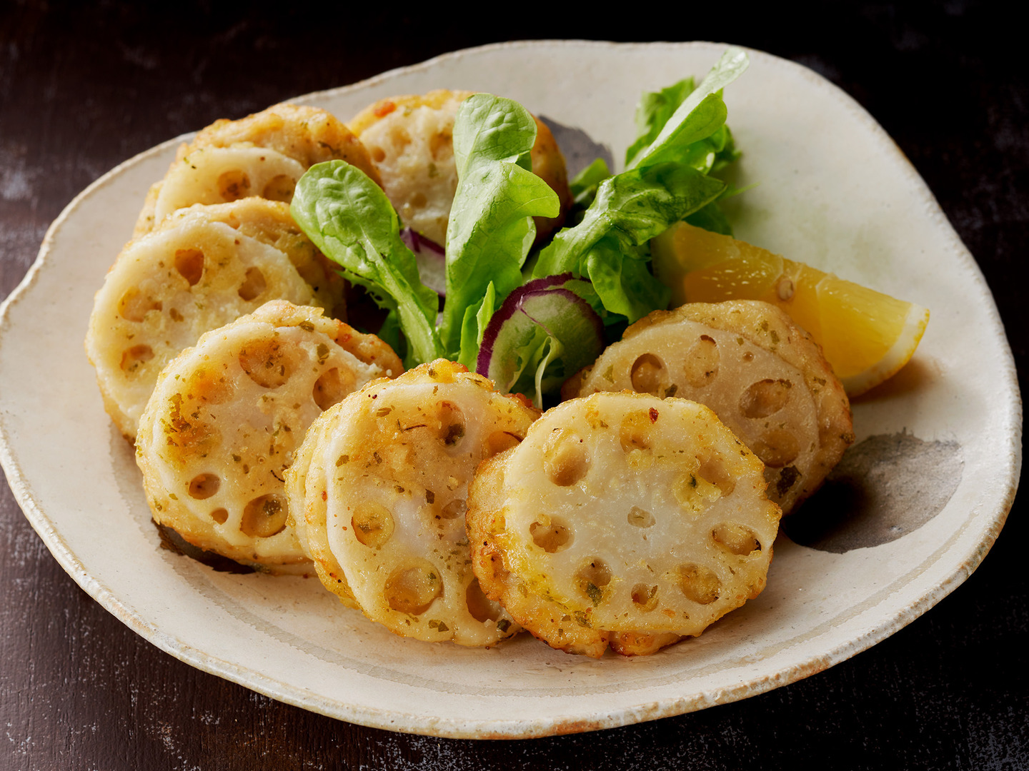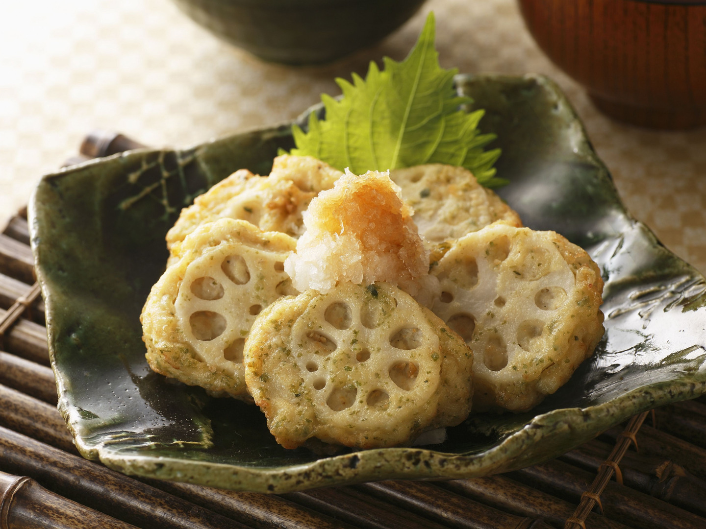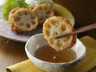 - やわらかなつくねをシャキッとした蓮根で挟んで揚げました