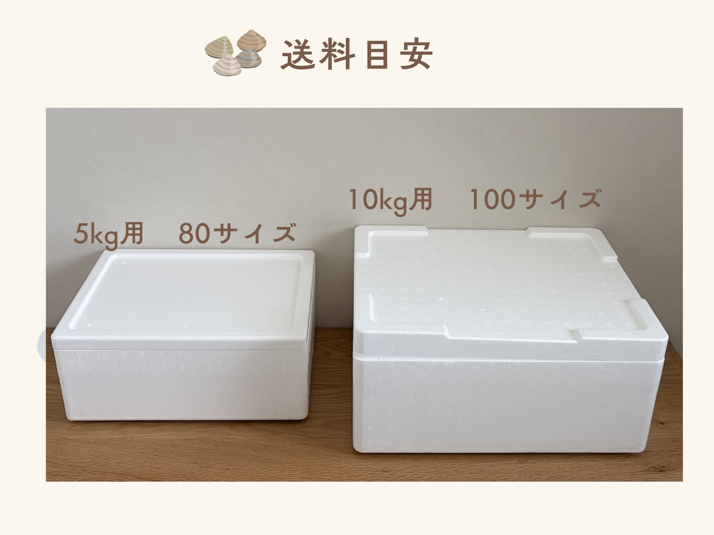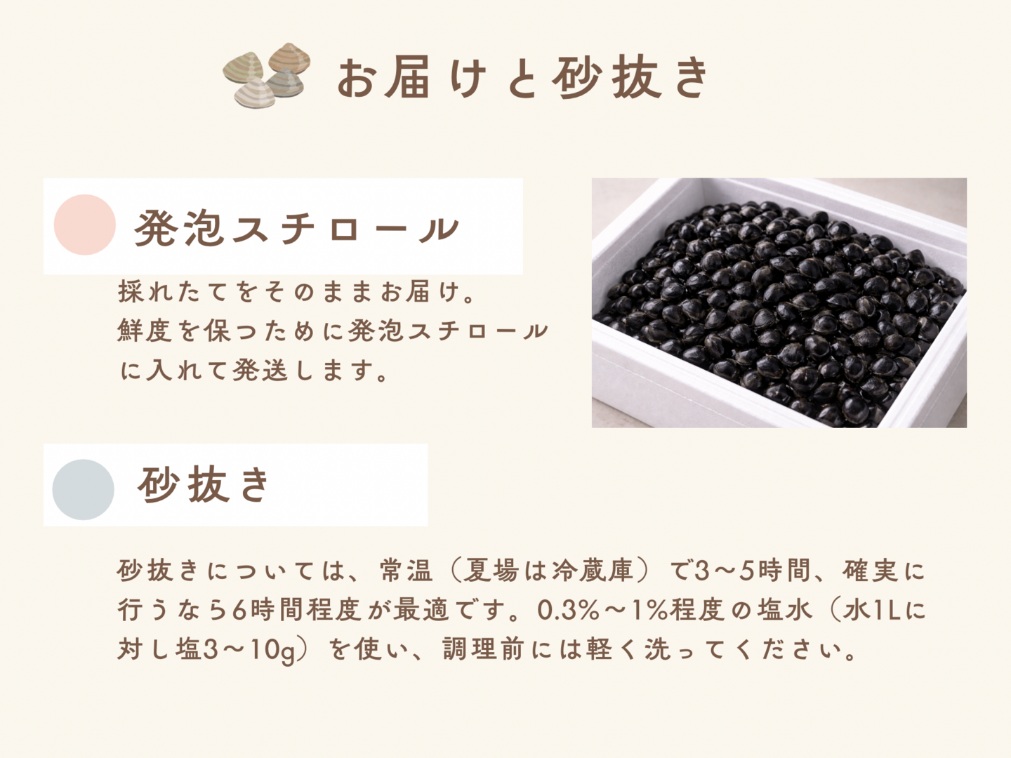 発泡スチロールでお届けします。砂抜きについては、常温(夏場は冷蔵庫)で3〜5時間、確実に行うなら6時間程度が最適です。0.3%〜1%程度の塩水(水1Lに対し塩3〜10g)を使います。