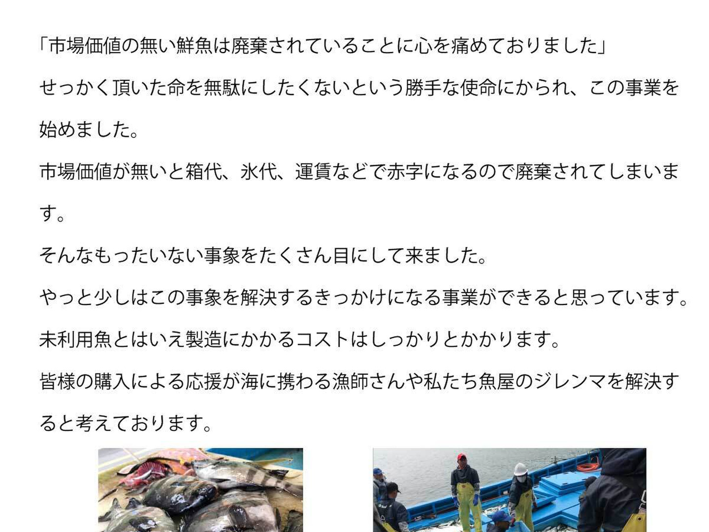 市場価値が無くて廃棄される魚や、低価格にて取引される旬を過ぎた魚などを利用しておりますが鮮度は抜群!