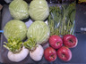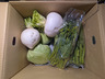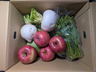 キャベツ2.5kg、カブ1.5kg、アスパラ菜500g、リンゴ1.6kgの詰め合わせです。