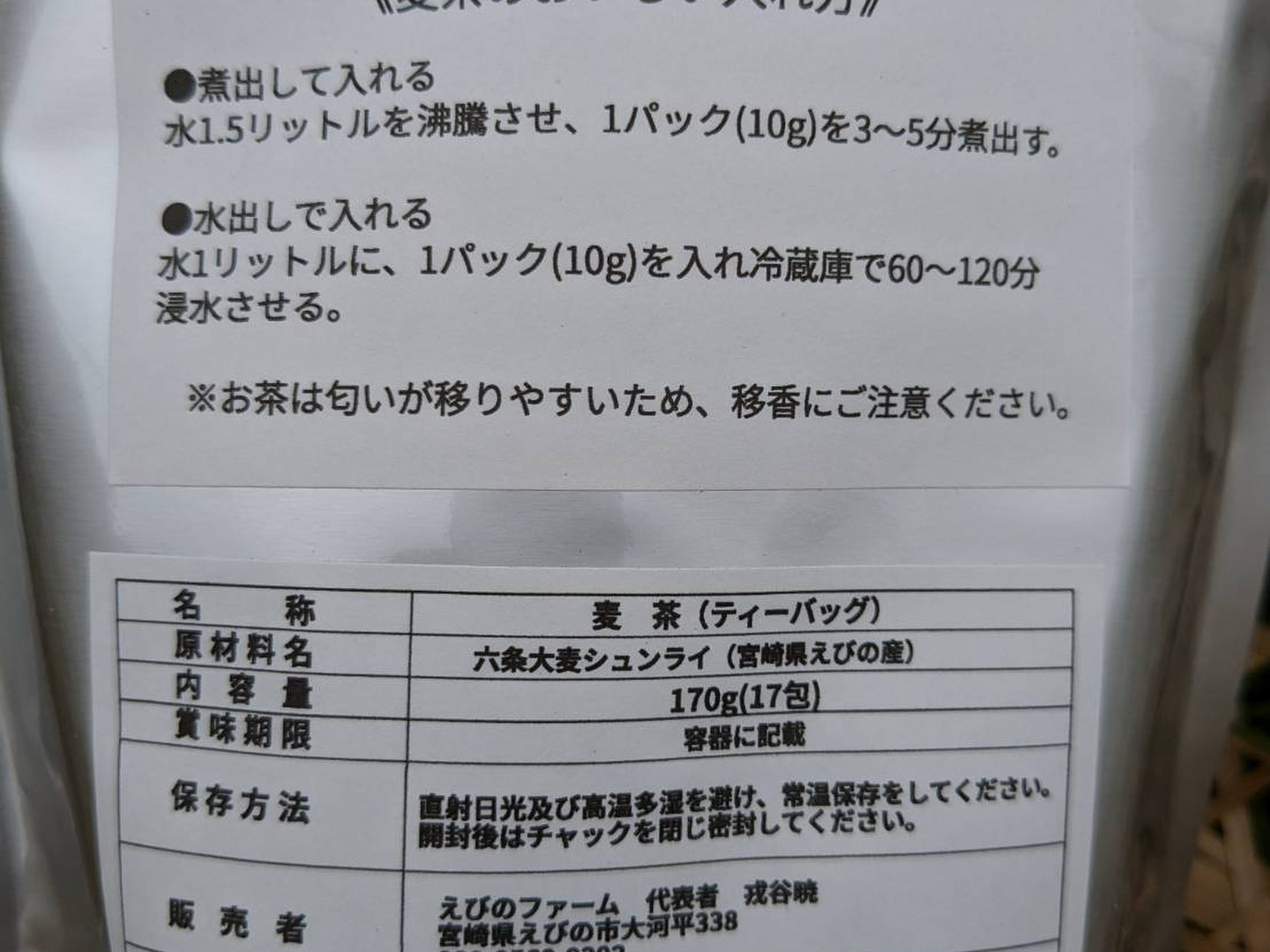 宮崎県えびの産六条大麦使用の麦茶 2袋セット(1袋内容量/ティーバック10g×17包)