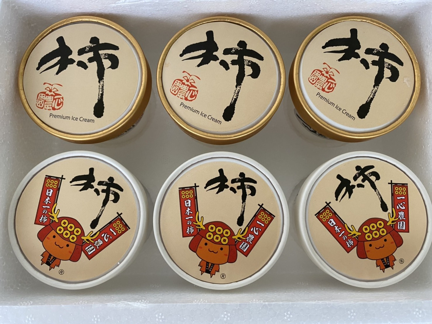 ミルクアイスの中に自家製富有柿チップを混ぜ込み、一心農園自慢の甘熟富有柿で作った特製富有柿ジュレをのせて2層仕上てにした風味豊かな『ザ・プレミアム柿アイス』と、ミルクアイスに特製富有柿ジュレを混ぜ込んだ『一の心(いちのしん)柿アイス』の詰合せ。