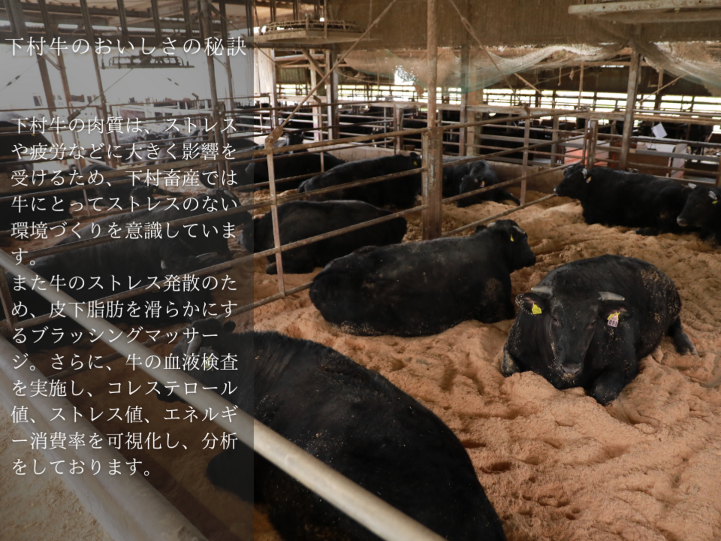 初代が農耕用の牛飼いを始めた事をきっかけに、80年あまりの歳月が流れました。三代に渡り最高品質の牛を育てるためにこだわっているのが「繁殖から肥育まで自社牧場での一貫生産」。愛知県大府市の豊かな大地で育つ唯一無二の黒毛和牛、三代で80年に渡り追求してきた究極の黒毛和牛それが「下村牛」