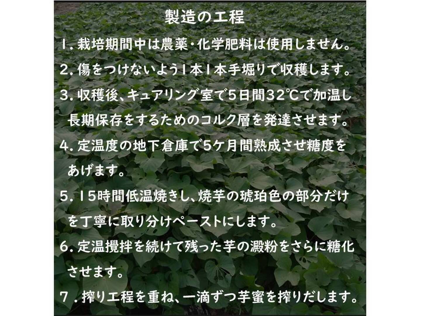 栽培期間中は農薬・化学肥料は使用せず栽培した甘藷(紅はるか)の、焼芋の蜜を一滴づつ丁寧に搾り出した芳醇なシロップです。