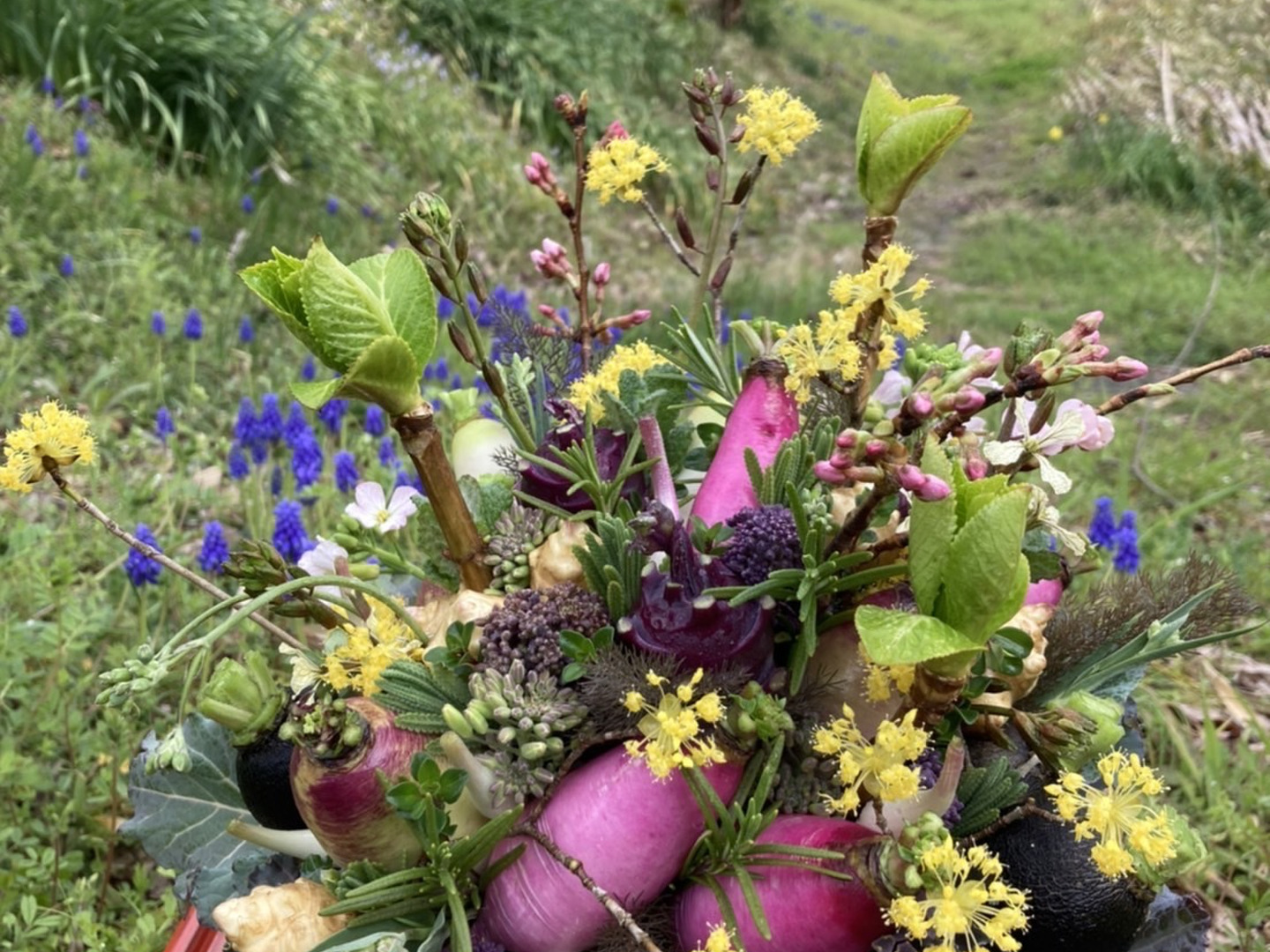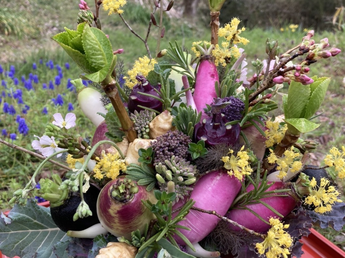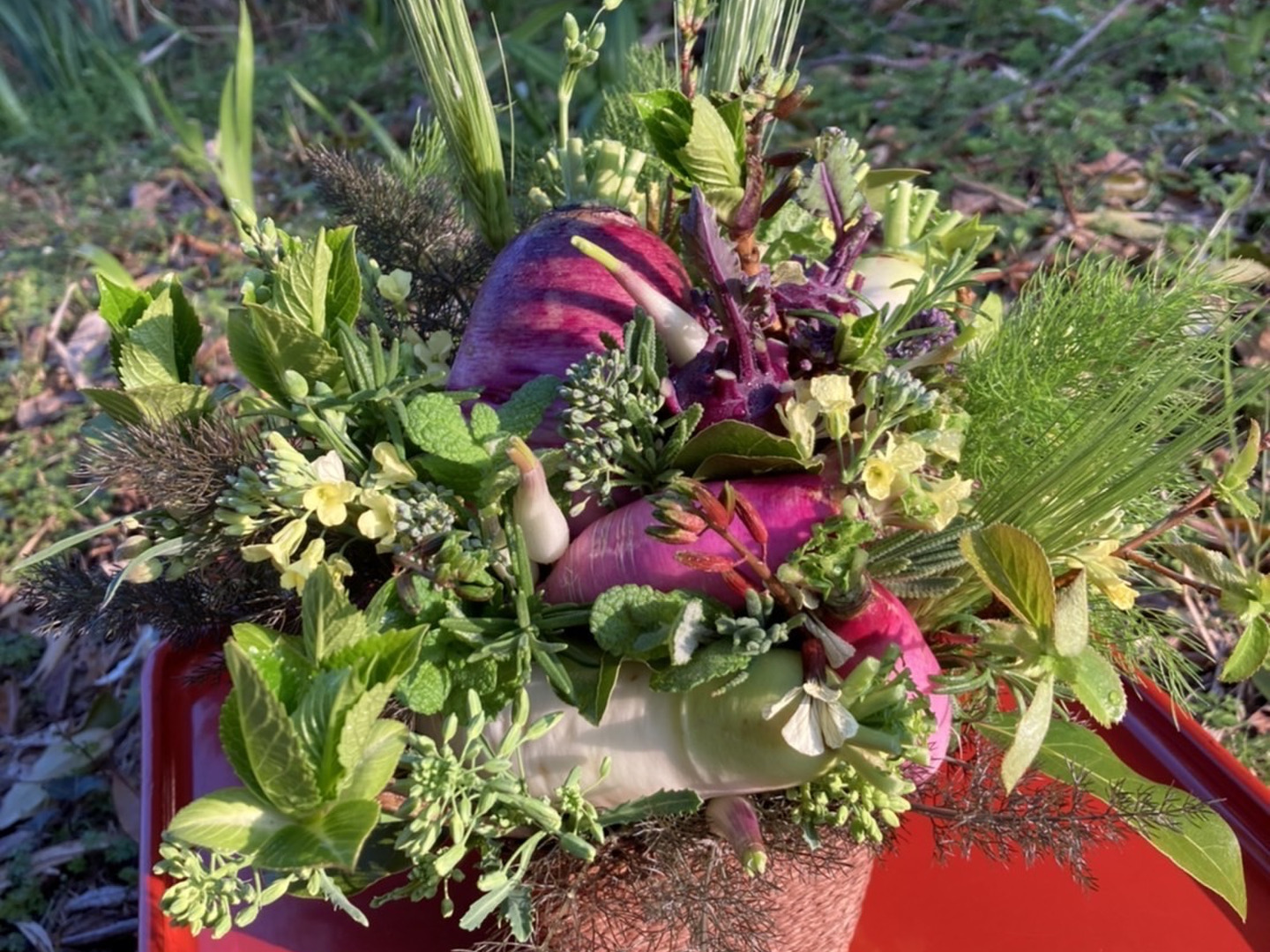 【期間限定】【春ギフト】花と野菜をミックスした ブーケ かごタイプ【カラフルなミニ野菜】【お誕生日】【開店祝い】【周年祝い】【お供え】