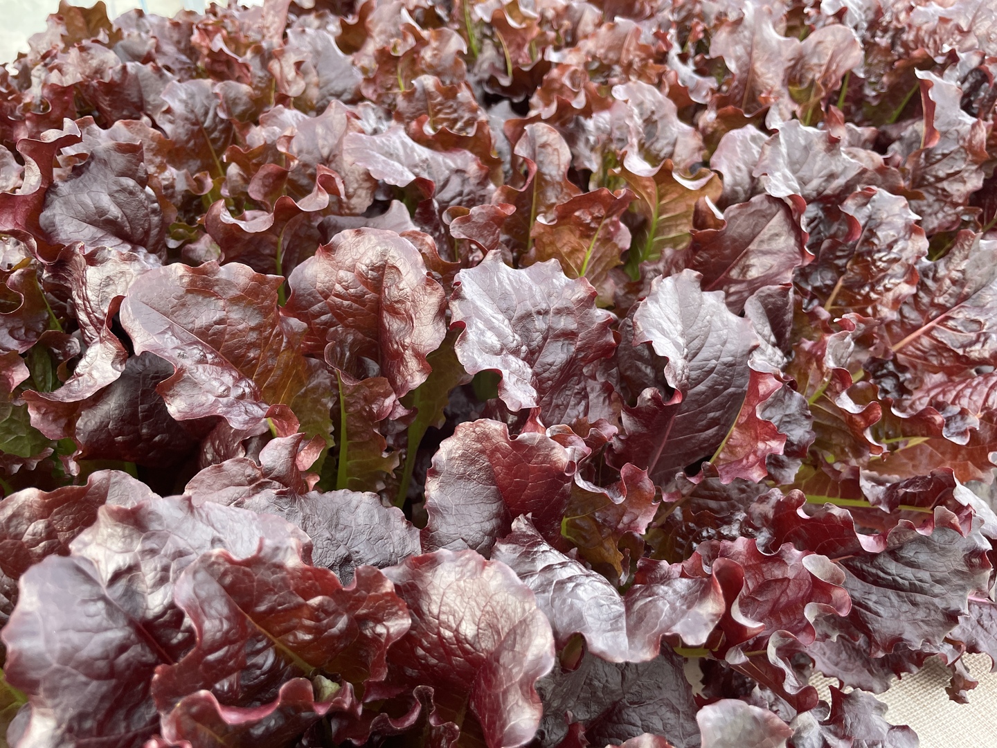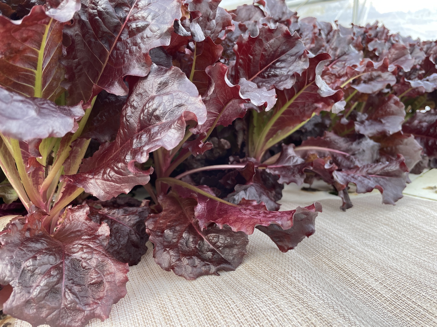 クリーンな環境のビニールハウス内にて水耕栽培された、真紅のサニーレタスです。