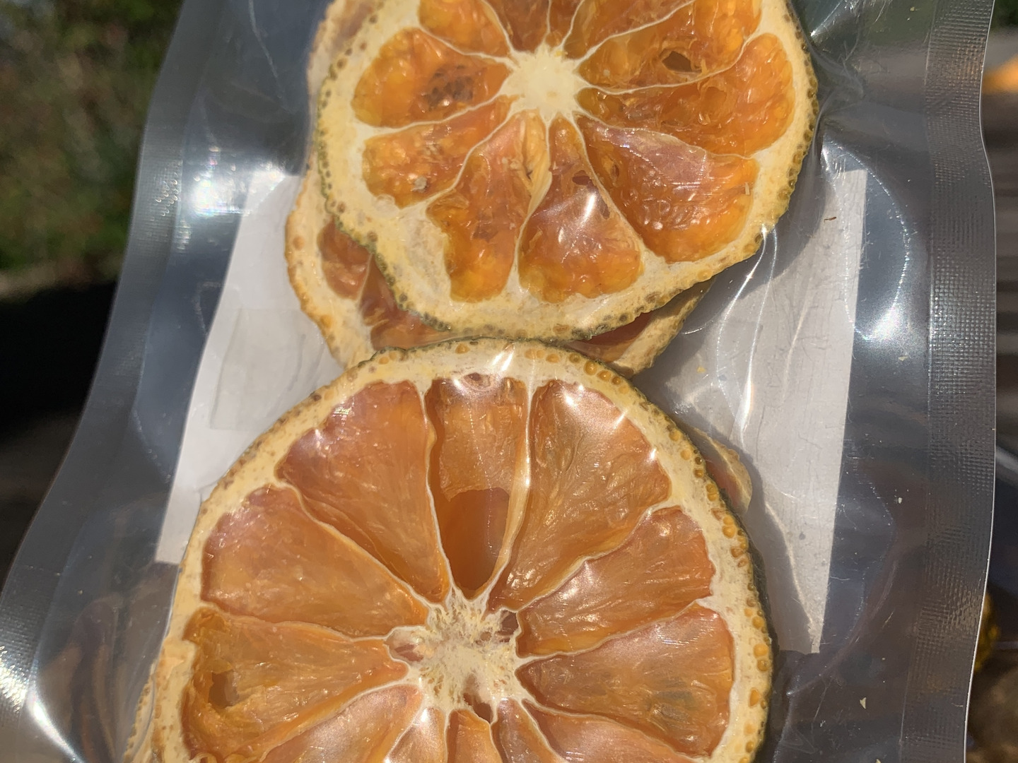 訳ありみかんを洗って、傷みや黒ずみなどの難を一つ一つ丁寧に取り除き、皮ごとスライスして乾燥させ、低温でじっくり熟成させました。