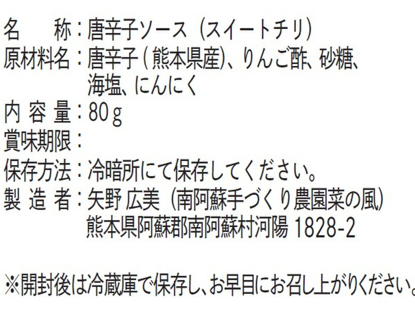 きび砂糖の優しいあまさが魅力のスイートチリ風味。甘酸っぱいマイルドな辛さが好評。