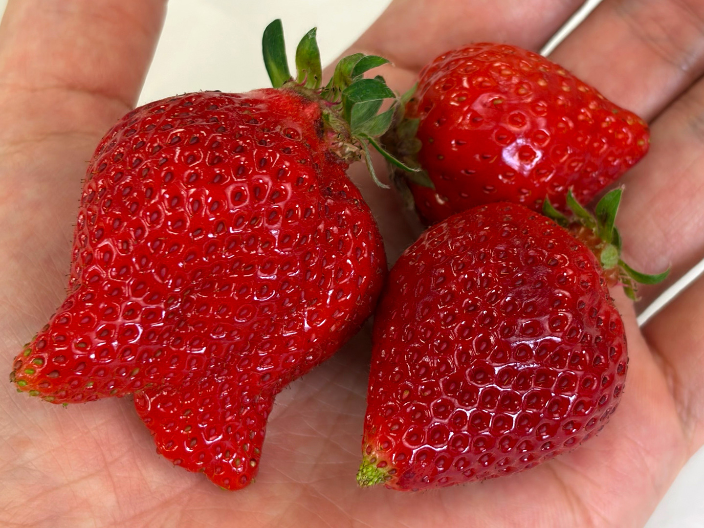 成長の過程でできるユニークな形・不揃いのサイズ 、完熟収穫のため、やわらかめの果実が混ざる