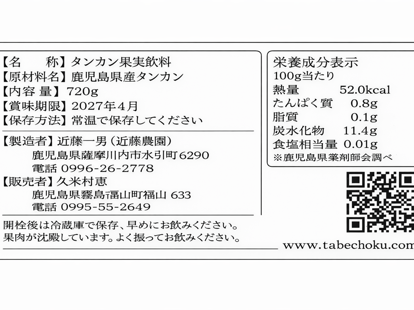 商品について あわせ買い対象 同生産者の別の「あわせ買い対象」商品と一緒にご注文いただくと、送料をまとめてお届けできる場合があります。 生産者からのお知らせ お客様へ久米村農園では収穫後のタンカンを約1週間寝かせた後、25℃に保った貯蔵庫で追熟剤と一緒に48時間保管後に選果してサイズを2L、L、M、S、2S以下に分け、更に一級品と二級品に仕分けてから出荷します。その作業を1週間毎に繰り返しています。一度に貯蔵庫に入るコンテナ(約20kg入り)は24-25ケースほどに限られる為に、1週間でご提供出来るLやMサイズの個数には限りがある上、収穫した木の状態により変動します。そのため1回の選果毎に注文が在庫数を超えると出荷可能な時期を次回の選果を行う予定日以降(1週間先)に設定させて頂いています。 もっと見る 重量・容量 約720g 発送 ヤマト運輸(食べチョク特別送料) 送料 ¥ 常温便 + ¥ 0 複数注文すると送料がまとまります。 種別 果物 みかん・柑橘類 果物 その他柑橘 たんかん 加工品 飲料 ジュース 産地 鹿児島県 特定原材料 なし 慣行栽培 果物 加工品 たんかん ジュース 鹿児島県x果物 鹿児島県x加工品 鹿児島県xみかん・柑橘類 鹿児島県xその他柑橘 鹿児島県x飲料 鹿児島県xたんかん 鹿児島県xジュース 商品説明 完熟タンカンを贅沢にそのまま絞って作った100%タンカンジュースです。添加物は一切使わないタンカン果汁のみのジュースです。糖度14度以上ですが、酸味と甘みのバランスが取れた濃厚な味わいです。 もっと見る この商品のことをお友達にもシェアしませんか ポスト シェア