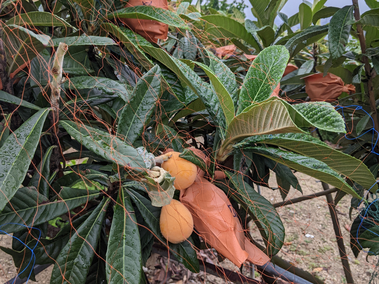 袋掛け露地栽培をしています。樹形を放射状に誘引しています。枝を低く放射にする事で、日当たりが良く果実の糖度が上がります。又 枝を固定することで台風又強風等により枝の揺れを少なくして果実が傷むのを防いでいます。