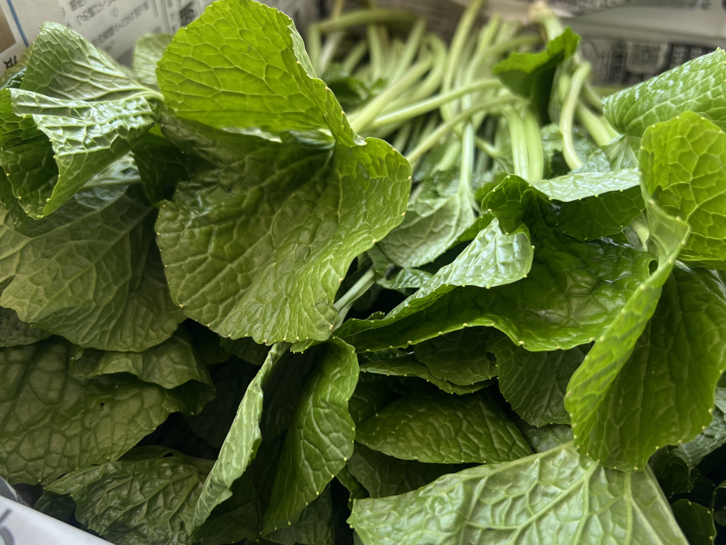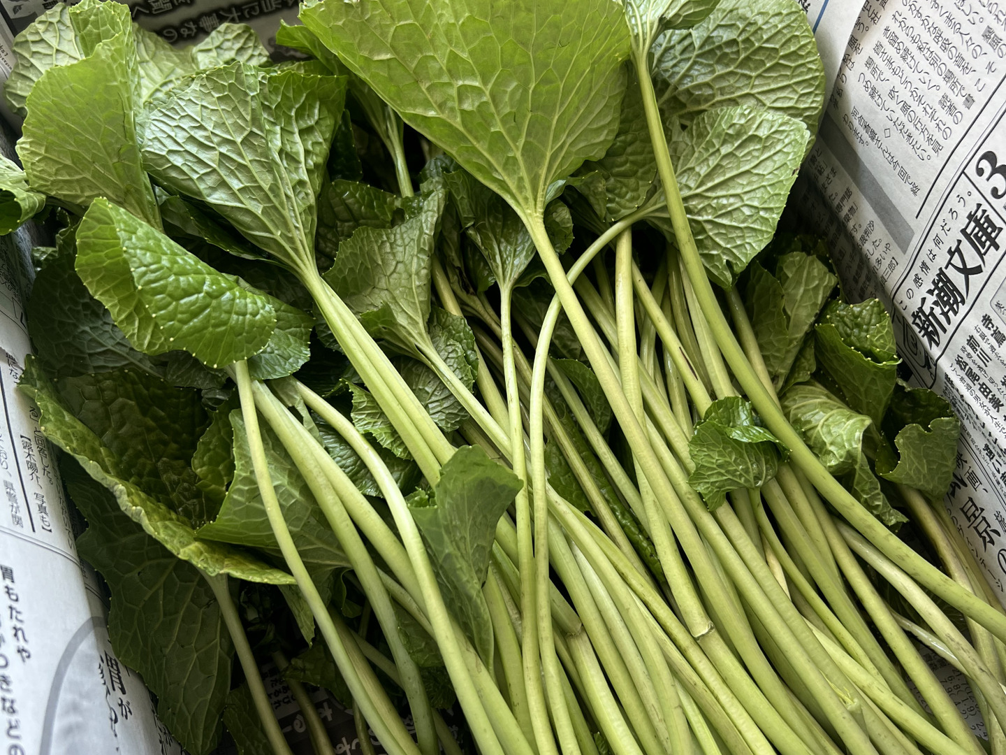 葉付きの茎(1kg): シャキシャキした食感の茎と葉。お醤油漬けや三杯酢漬けはもちろん、葉の天ぷらは産地ならではの贅沢な味わいです。