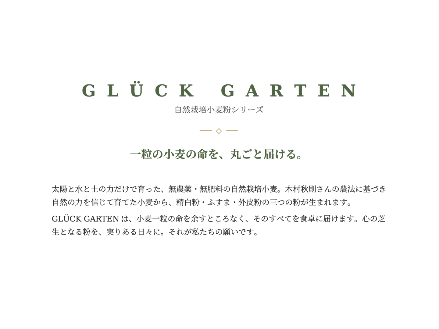 GLÜCK GARTENの「幸せの庭」という名前には、自然の恵みをそのまま食卓に届けたいという想いを込めています。精白粉、ふすま、外皮粉。三つの粉は、一粒の小麦の命を余すところなく届けるという、私たちの約束のかたちです。