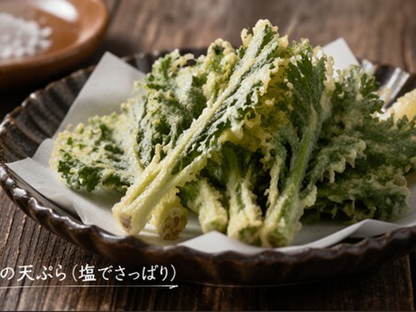 ポイント: 揚げたての春菊は香りが格別。塩で食べると、シュンギクの甘みが際立ちます。