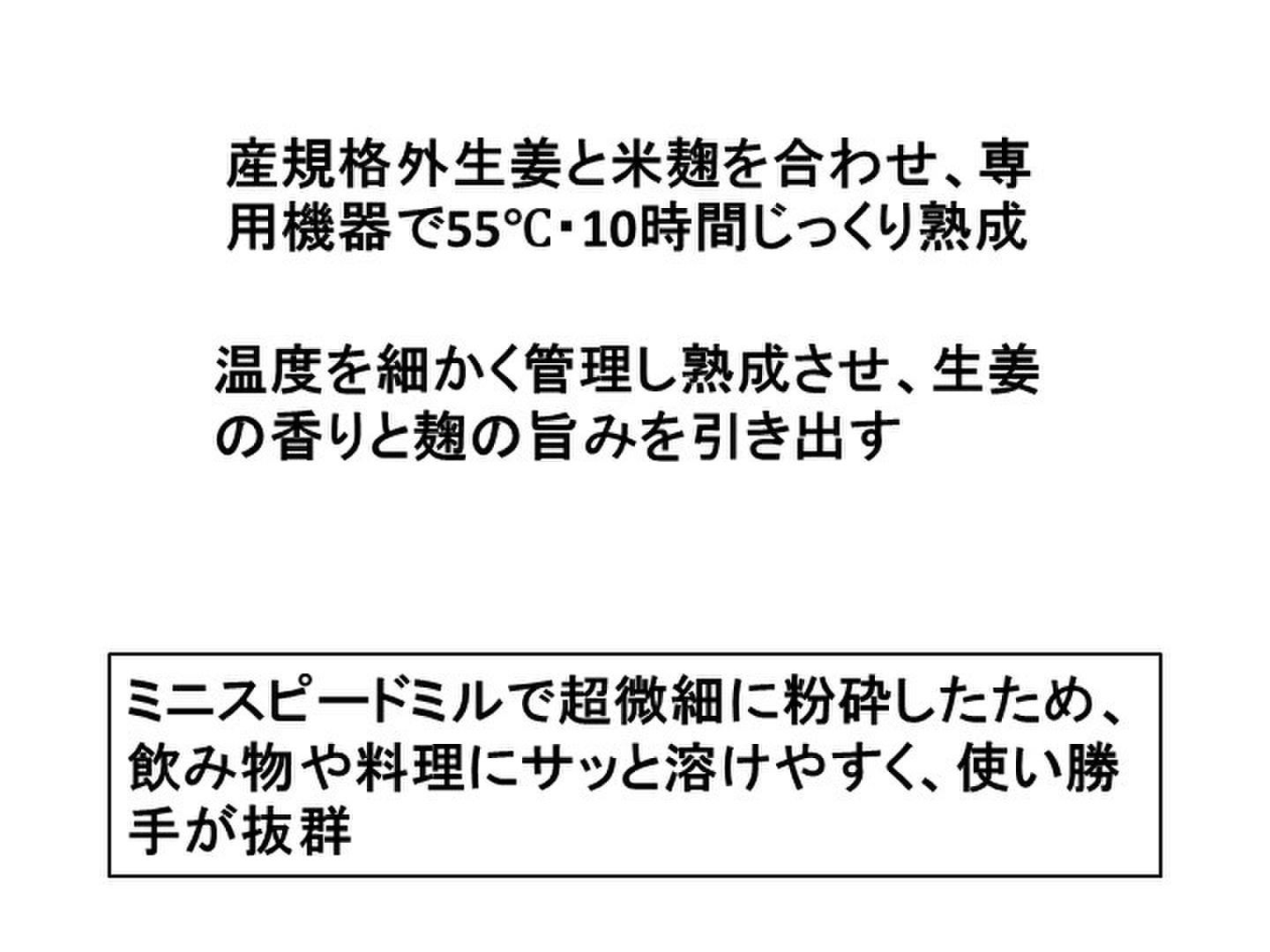 覚醒させた蒸し生姜パウダーに佐賀県産米麹を黄金比(生姜パウダー1:米麹4)でブレンド。55℃で10時間じっくり熟成させることで、麹の酵素が働き、辛味を芳醇な旨味と優しい甘味に変化。