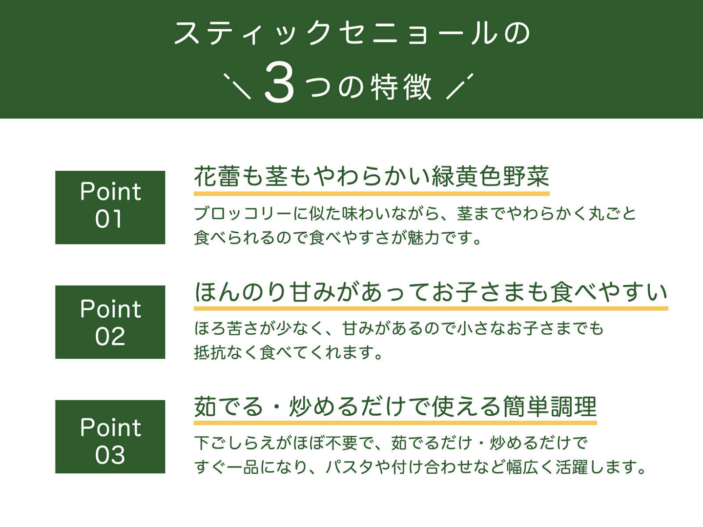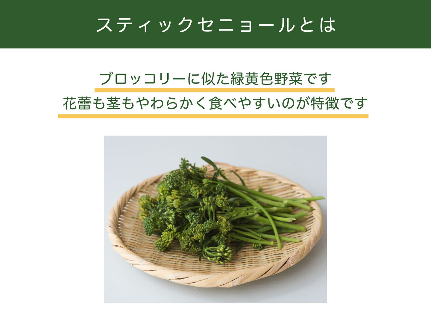 ブロッコリーに似た味わいですが、花蕾(つぼみ)だけでなく茎までやわらかく、丸ごと食べられるのが特徴です。