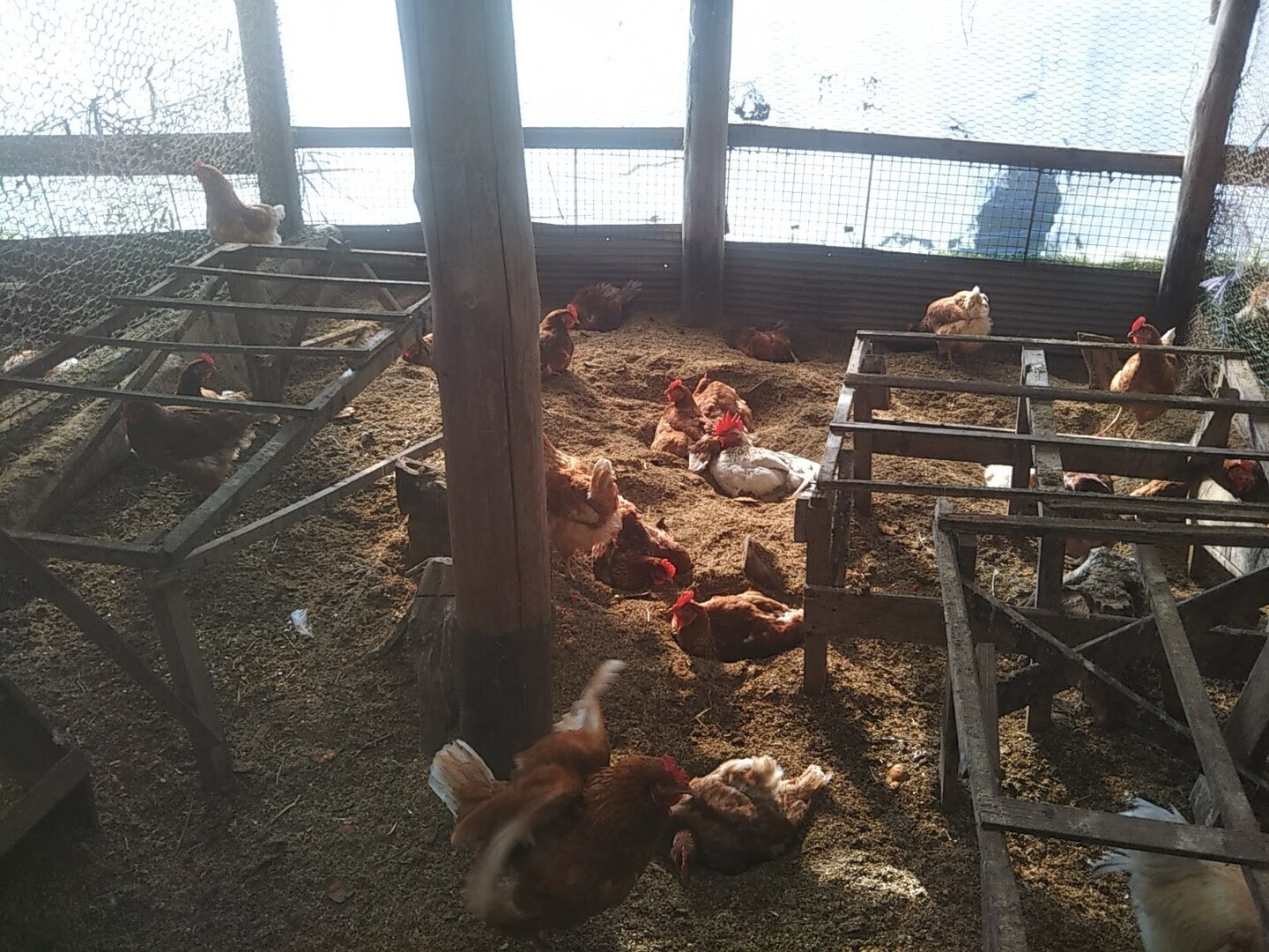 静かな山奥の、風通しの良い鶏舎(冬は風よけ設置)。農園内で豊富な青草や農薬不使用の野菜クズが入手可能。