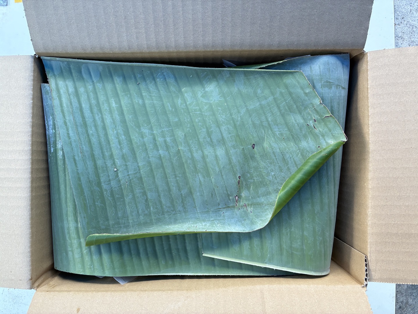 緩衝材としてバナナの葉を使用してお届けします。使用後は、バナナ葉茶や入浴剤として再利用可能です。プラスチックを使用しない環境配慮型の梱包で、南国の雰囲気もお楽しみいただけます。