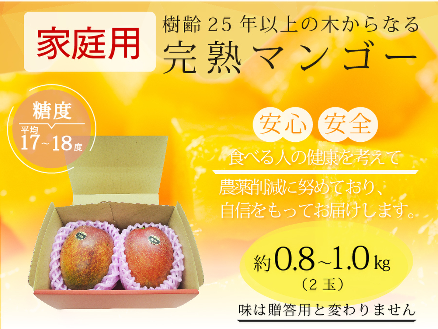 【食べチョク限定:家庭用】樹齢25年以上の木からなる糖度約17~18度の完熟マンゴー(2玉:0.8kg~1kg)