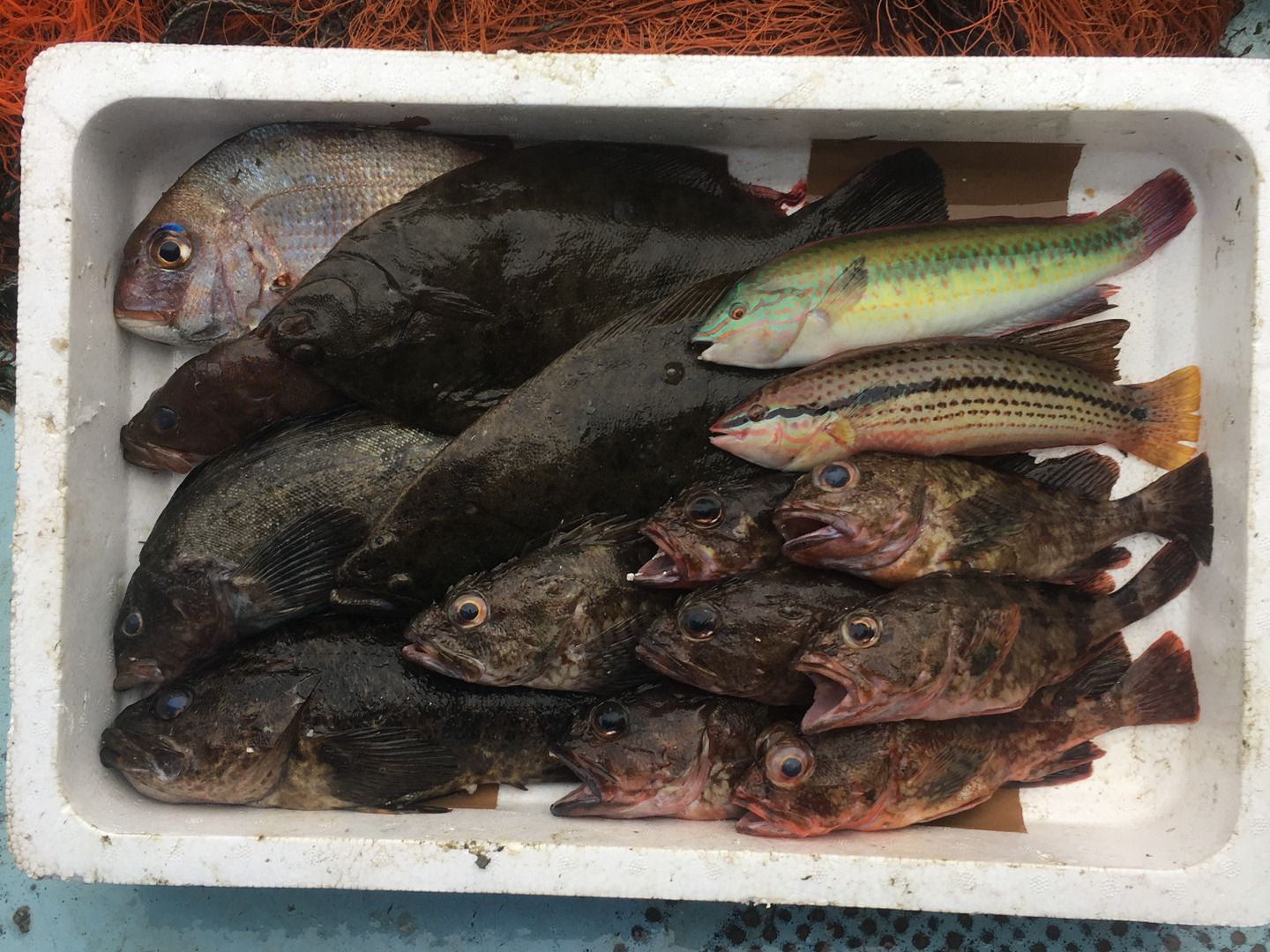 小豆島沿岸の磯で刺し網漁で水揚げされる、鯛 チヌ メバル カサゴ カワハギ その他珍しい魚など、20匹/10㎏程度。季節により中身はかわります。