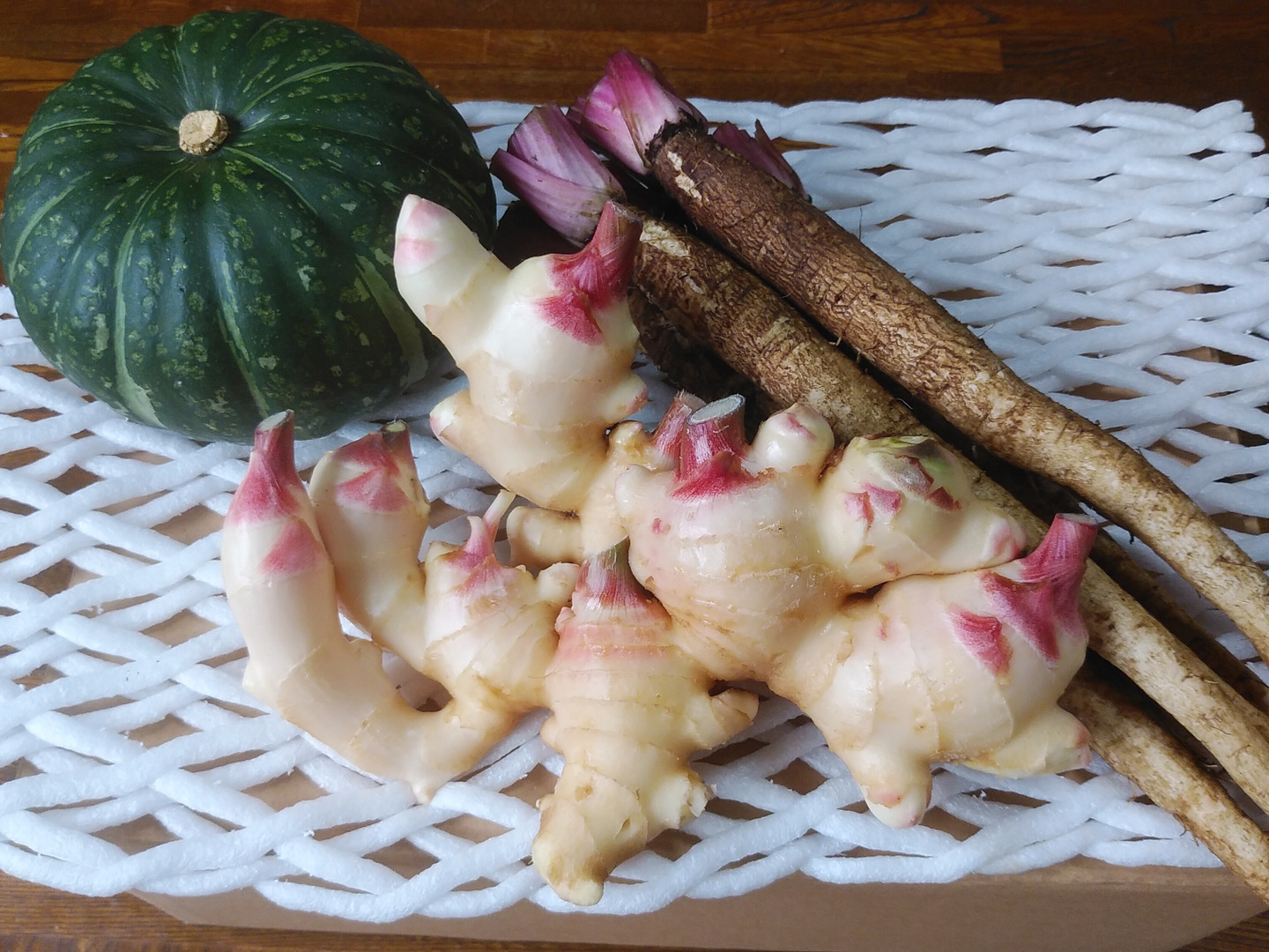 (ハウス新生姜1kg、ミニカボチャ約1kg、新サラダゴボウ約500g)