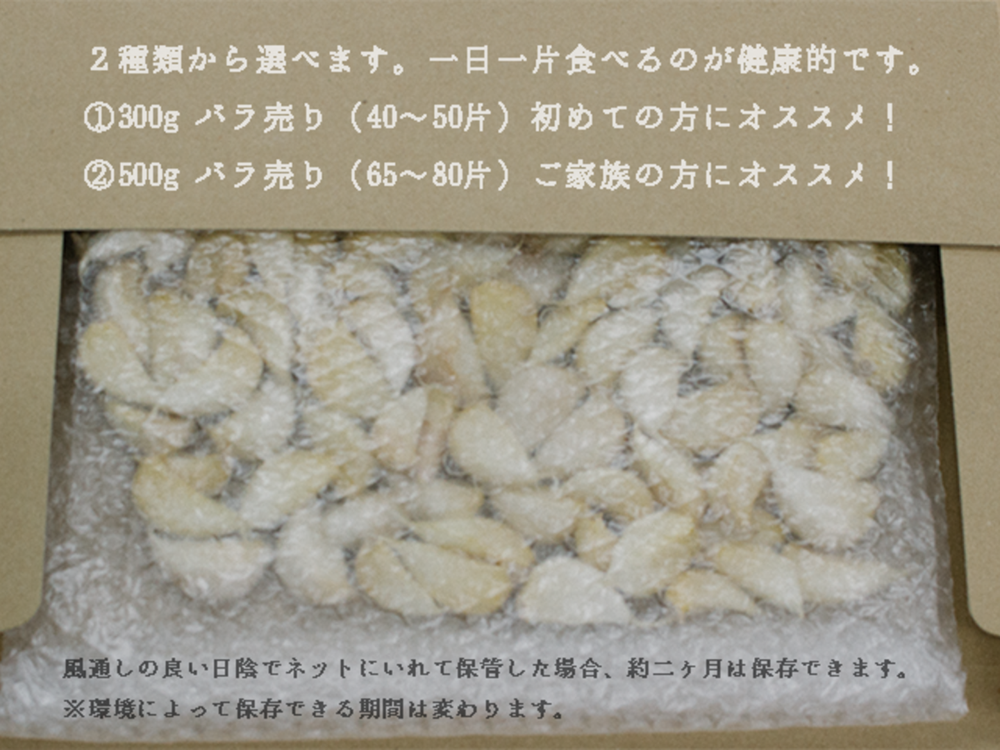 風通しの良い日陰でネットにいれた場合で保管した場合、約一か月は保存することができます。※環境によって保存期間が変わりますので、ご了承ください。