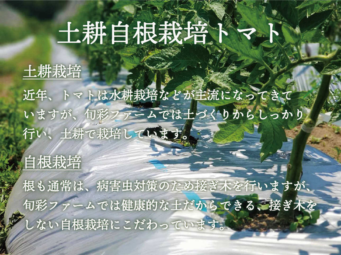 旬彩ファームでは、もっとたくさんの方に色々な種類のトマトがあること、楽しみ方があること、持続可能な農業のことについて知っていただきたいと思い、栽培方法や品種選びにこだわっております。