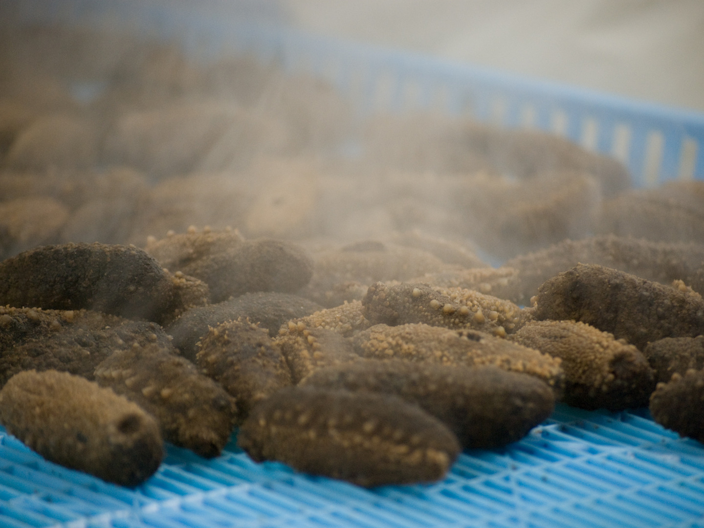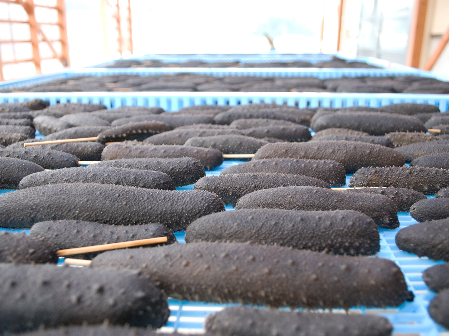 毎年2月〜3月に近海で漁獲されたなまこを、大釜でゆっくりと茹で、寒風に当ててじっくりと干すこと1ヶ月あまり・・