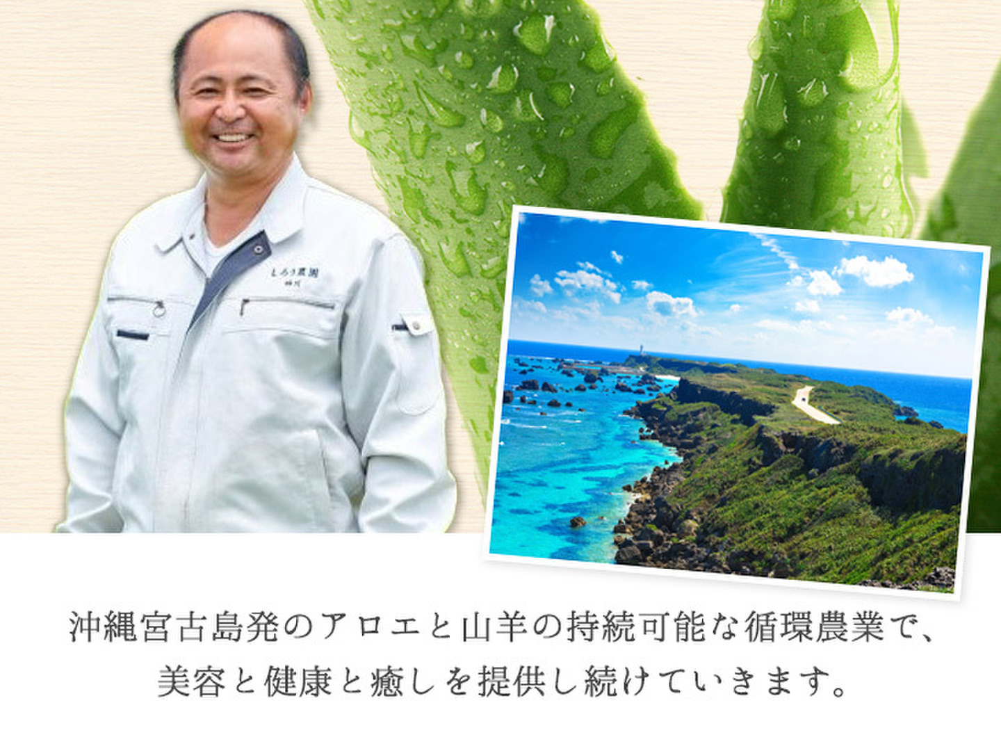 日本で栽培されているアロエベラは、狭い畑でのハウス栽培によるものがほとんど。でも、しろう農園のアロエベラは宮古島の広大な畑を活かした路地栽培を行っています。ふり注ぐ太陽と、自然の雨や、強い風の中で力強く育った自慢のアロエベラです。