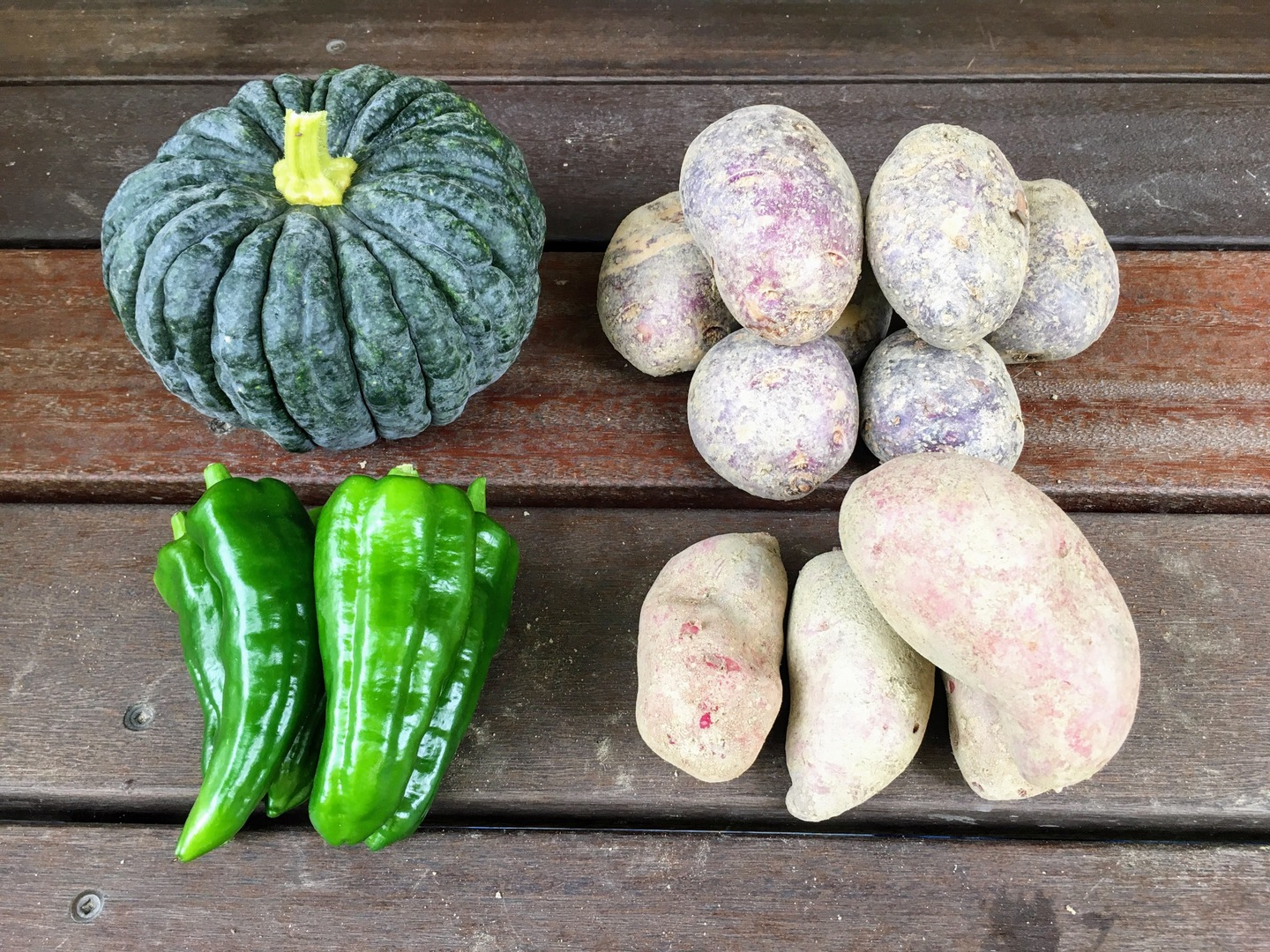 4品目詰め合わせ。紫色のじゃがいも、かぼちゃ、じゃんぼししとう。